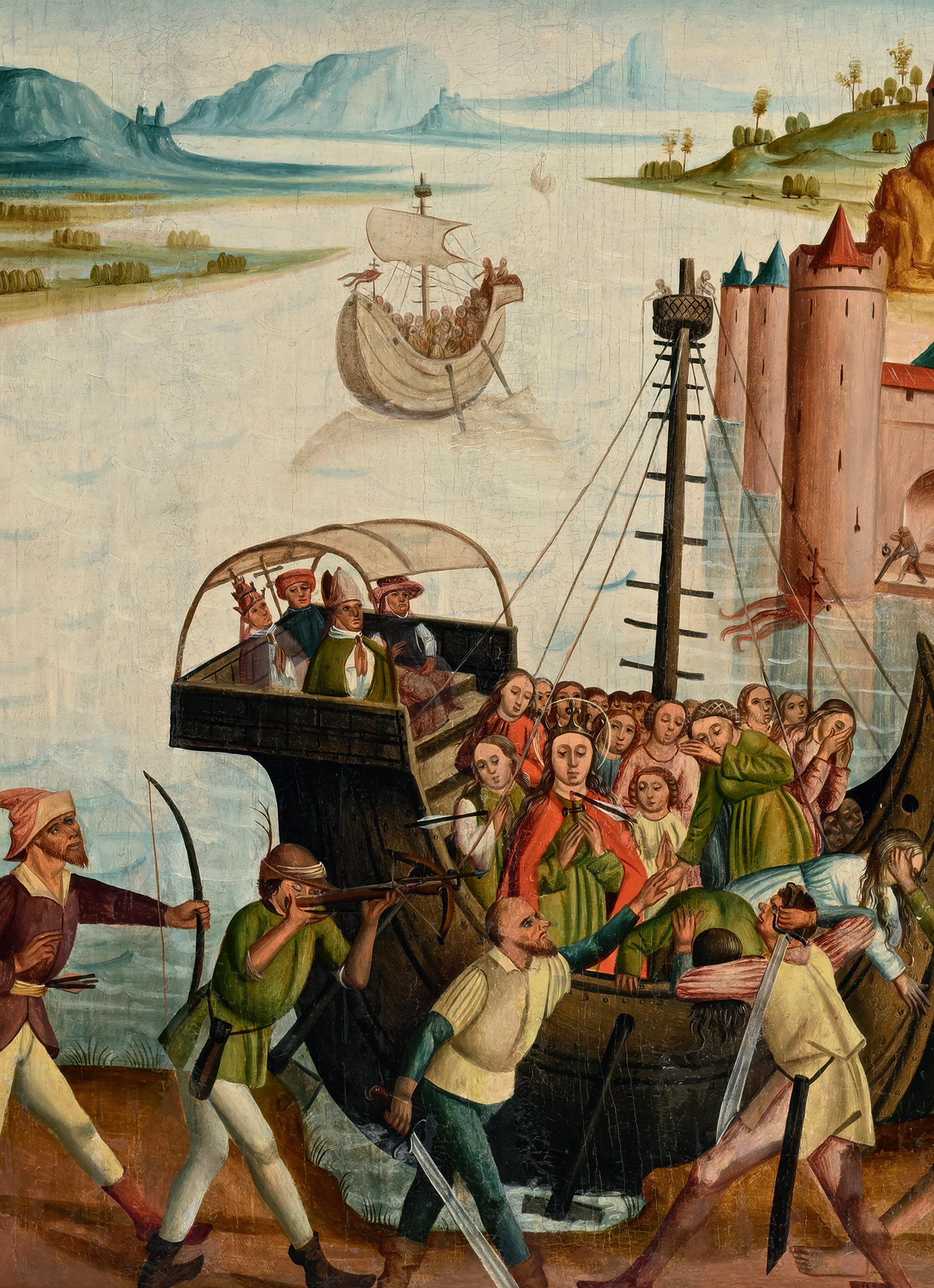 Cette œuvre de l’École de Cologne du XVIe siècle s’inscrit dans le cycle du martyre de Sainte Ursule, une série d’images relatant la légende de la Sainte et de ses compagnes, dont la popularité était particulièrement forte en Rhénanie. Fidèle aux caractéristiques de cette école, la peinture présente une composition dense et détaillée, une palette de couleurs vives et une approche narrative directe, marquant encore une influence gothique tardive malgré l’émergence des codes de la Renaissance nordique.