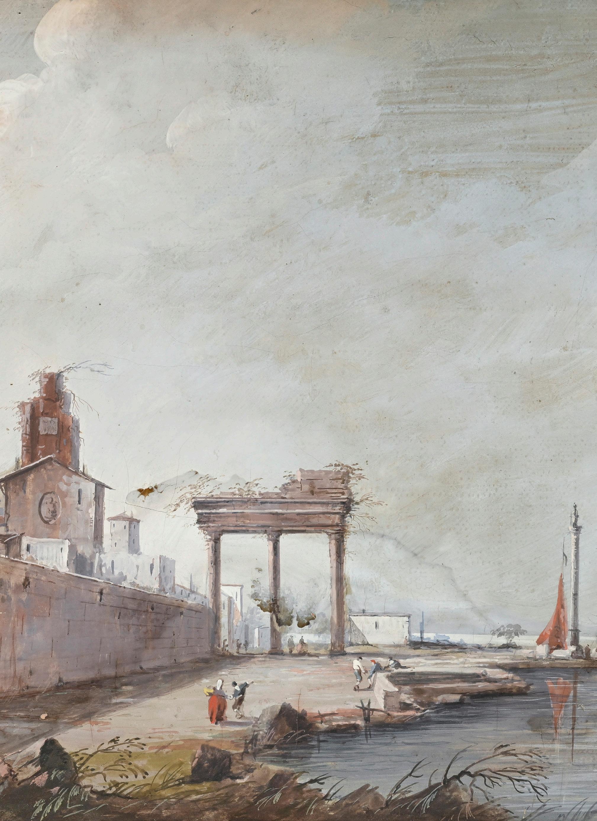 2045. Ecole vénitienne de la fin du XVIIIe s., Capricci, suite de 6 tempera sur toile, 22x38 cm (chaque)