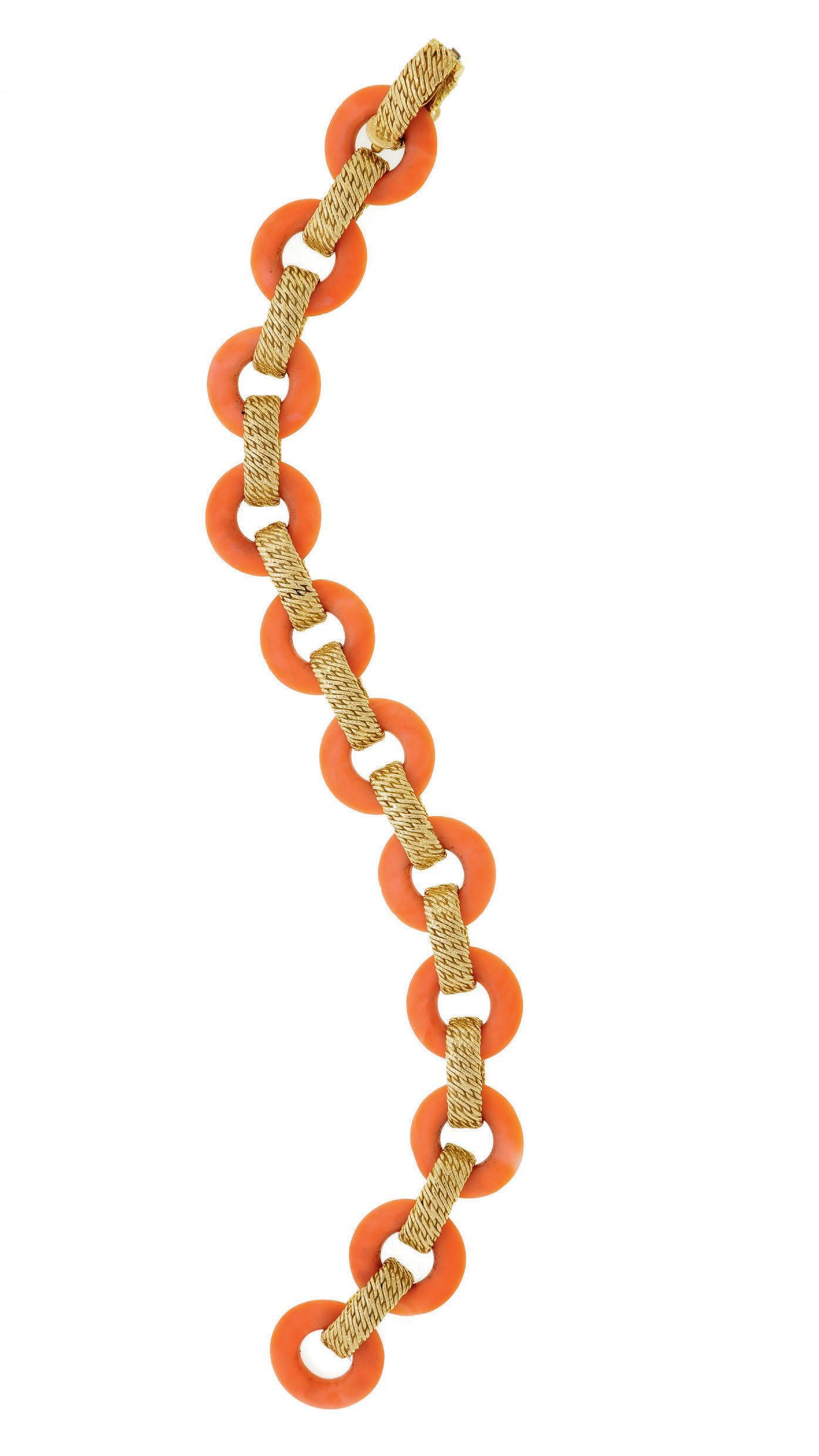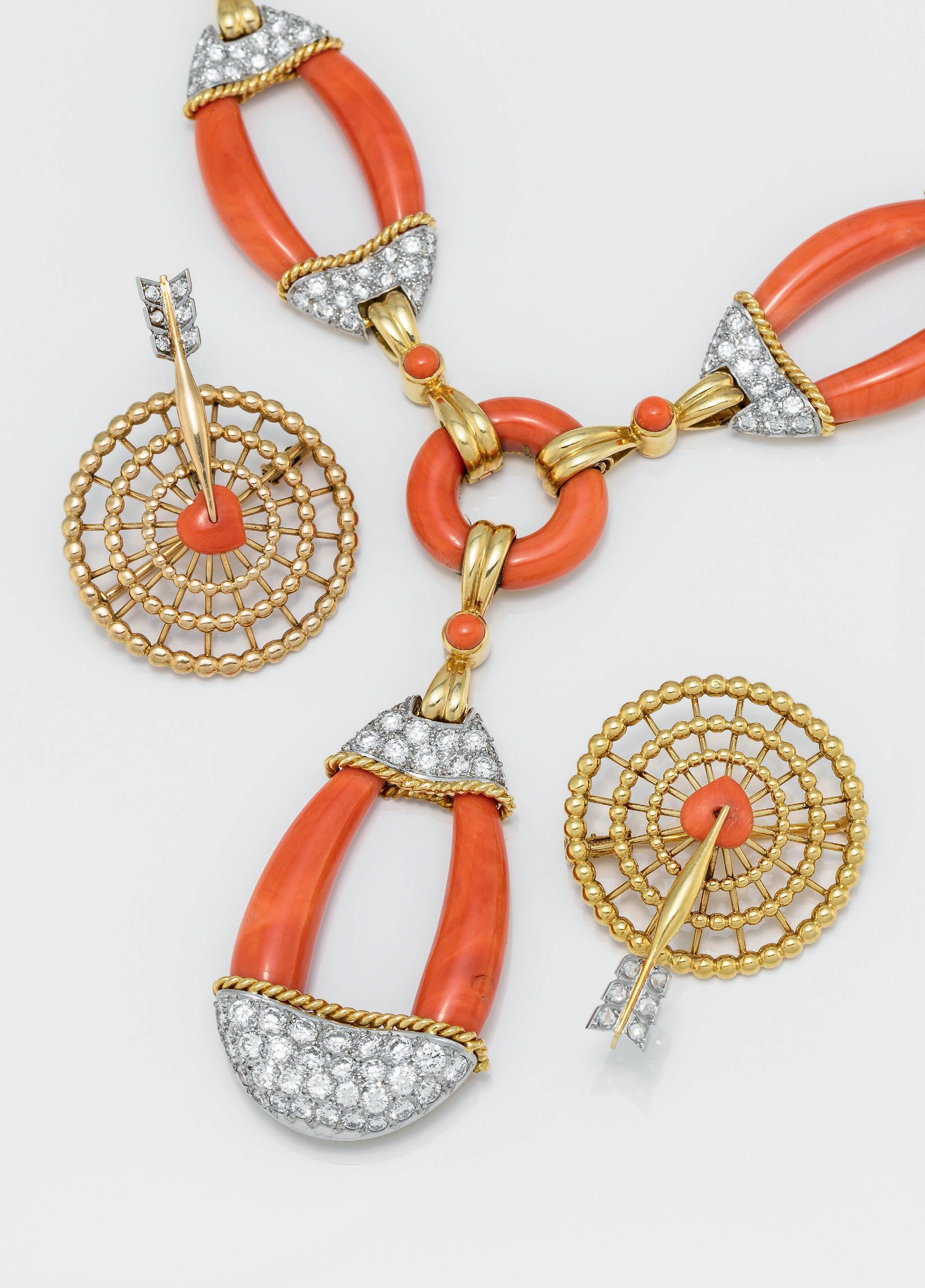 Cartier, 2 broches 1960 or 585, diamants et corail figurant des cibles perlées, h. 4.3 cm