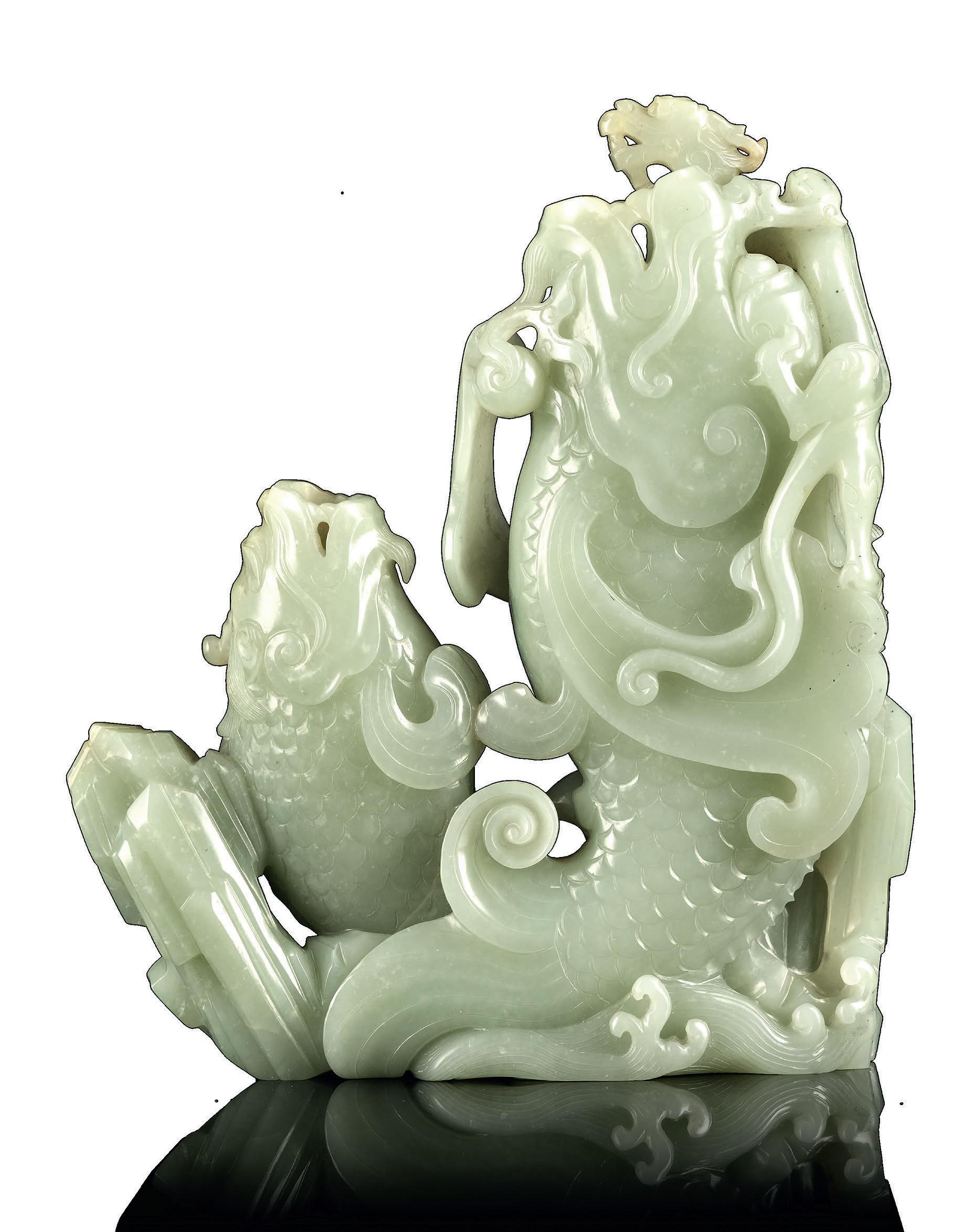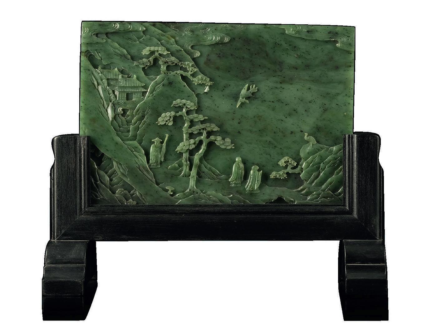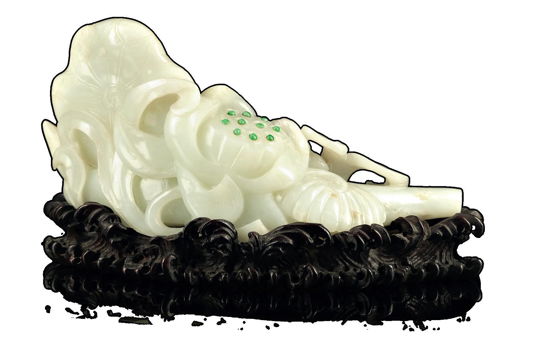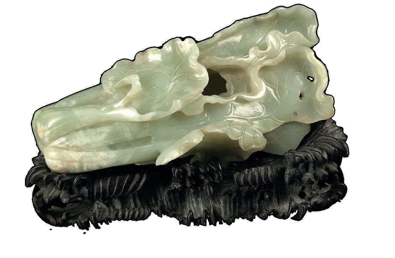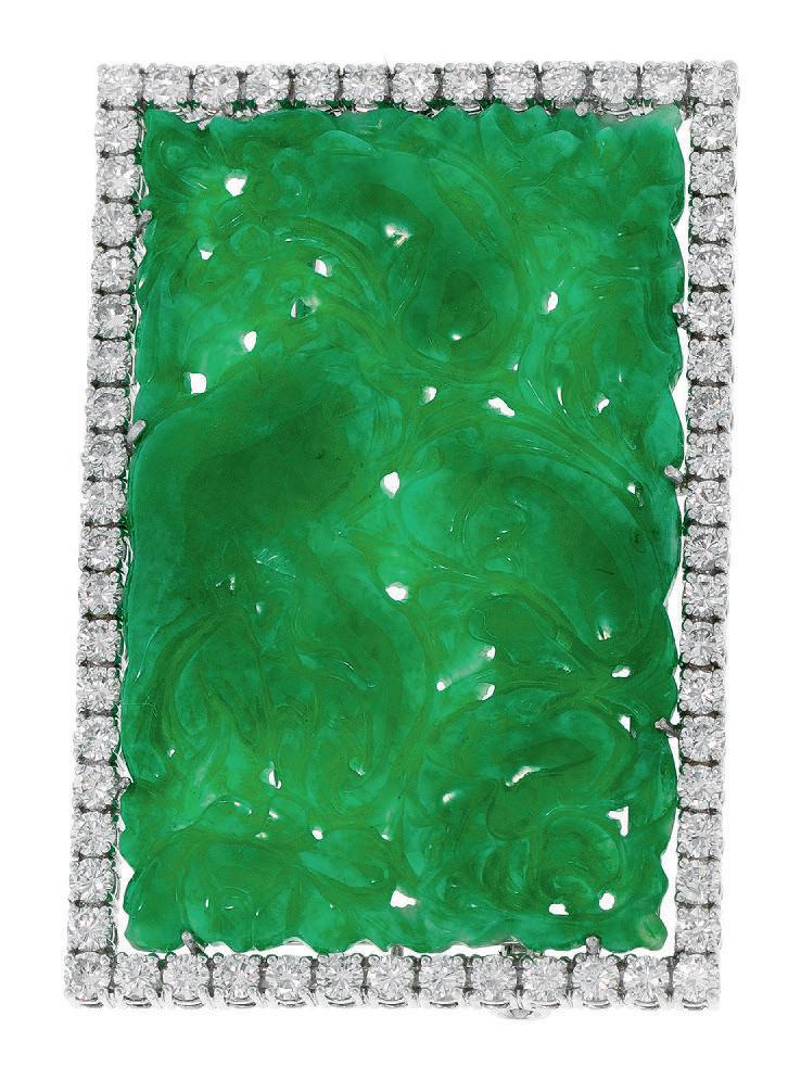 Broche rectangulaire or gris 750 ornée d'une plaque de jadéite gravée à décor d'un citron doigts, 4.8x3.2 cm 1.000-1.500