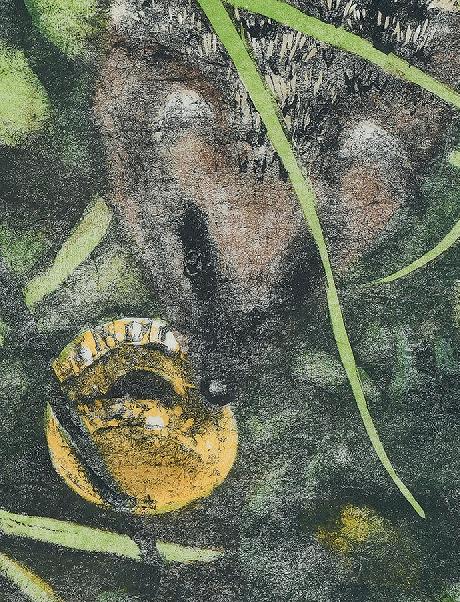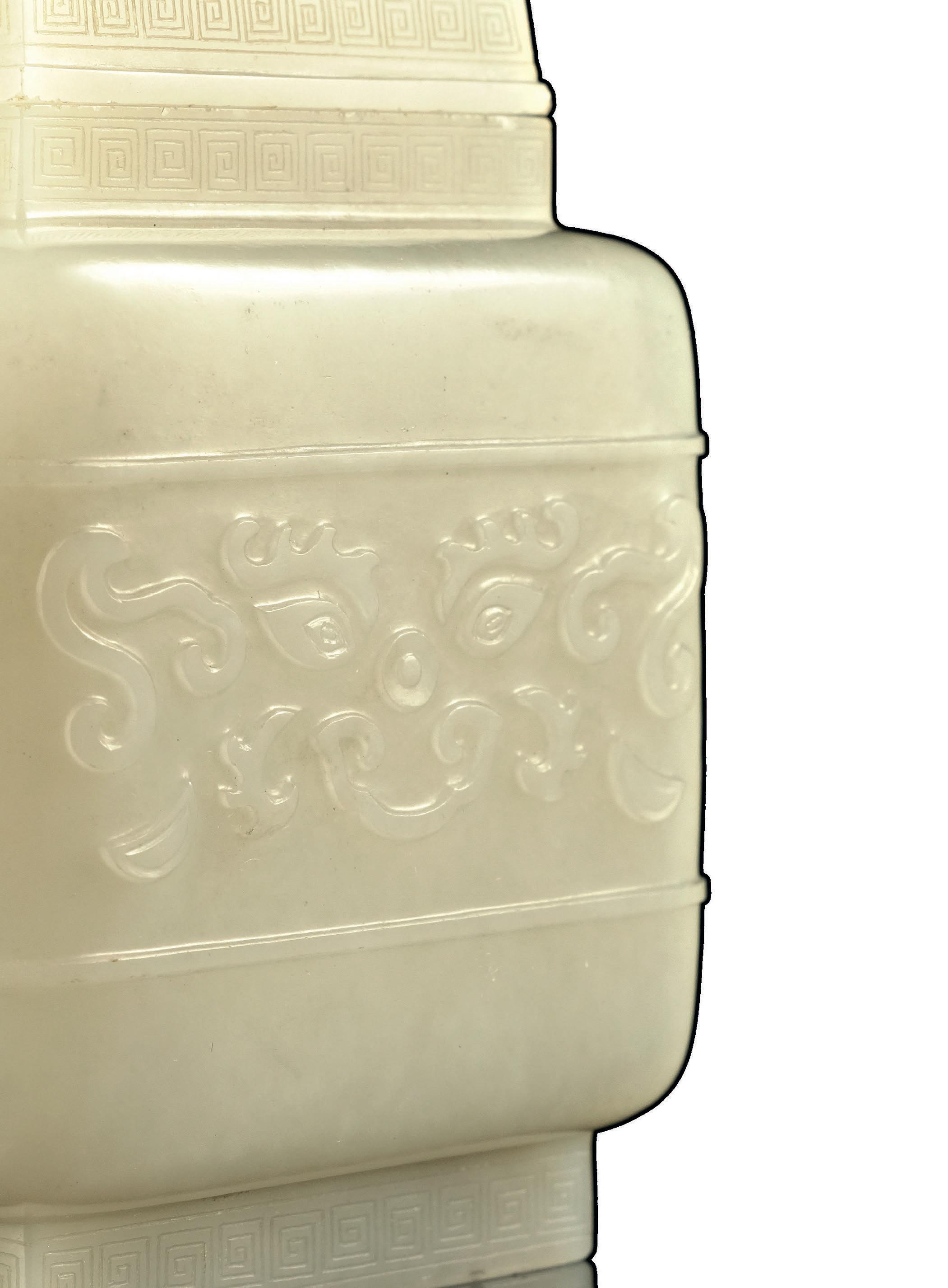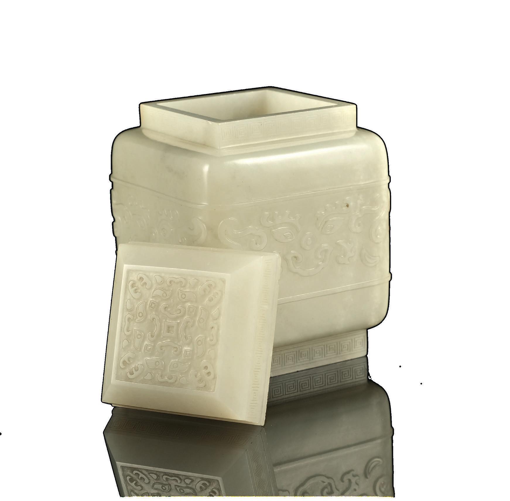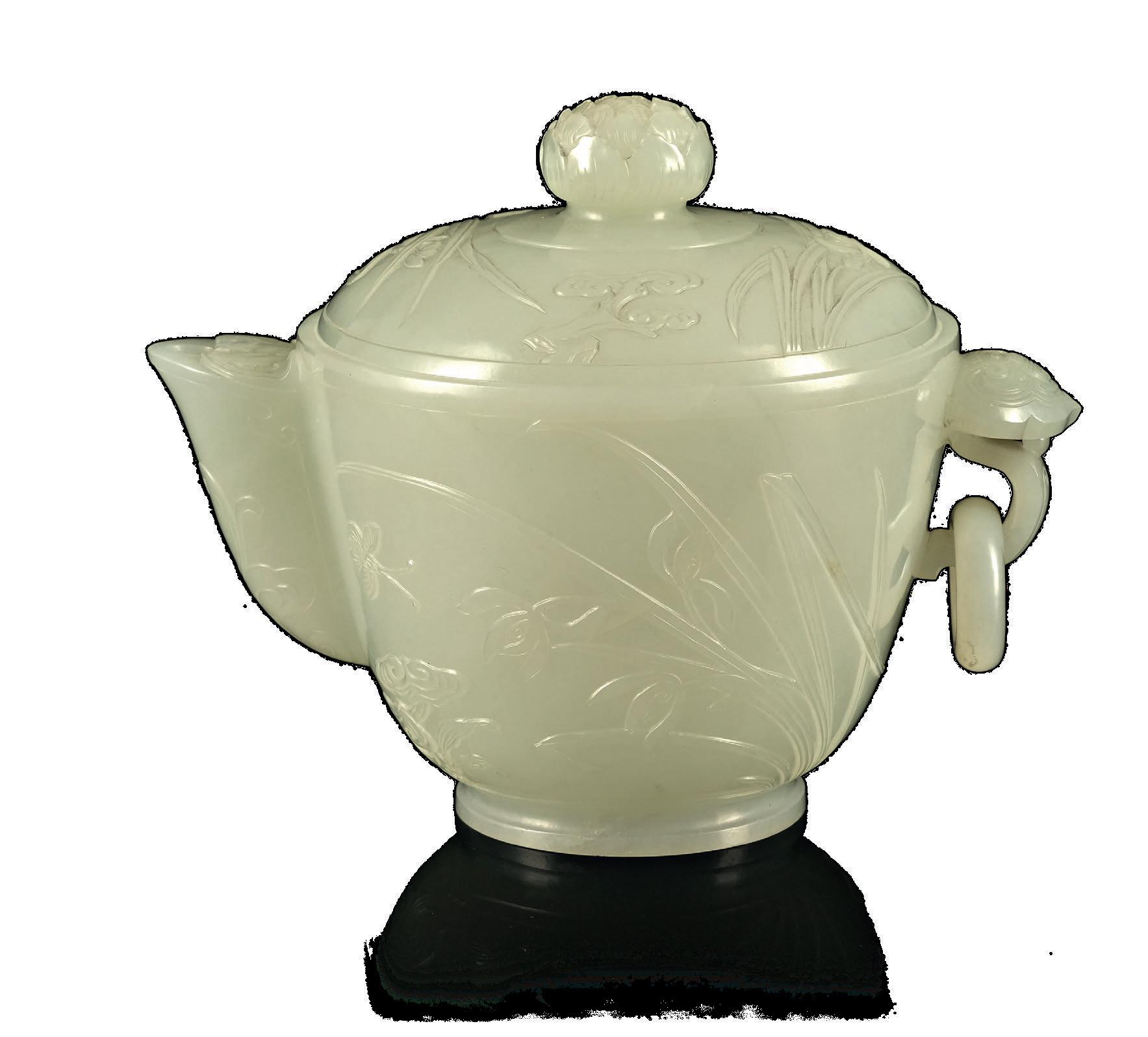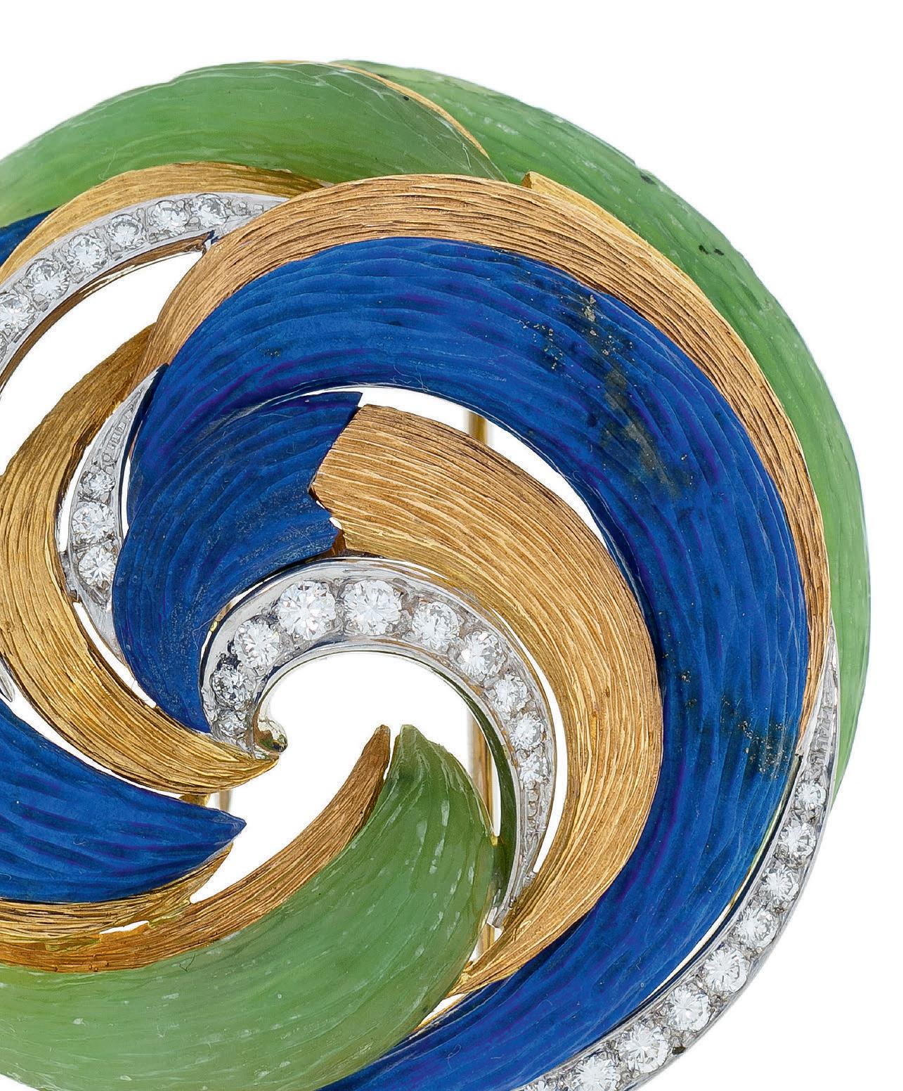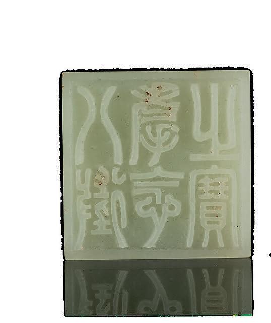 Broche rectangulaire or gris 750 ornée d'une plaque de jadéite gravée à décor d'un citron doigts, 4.8x3.2 cm 1.000-1.500