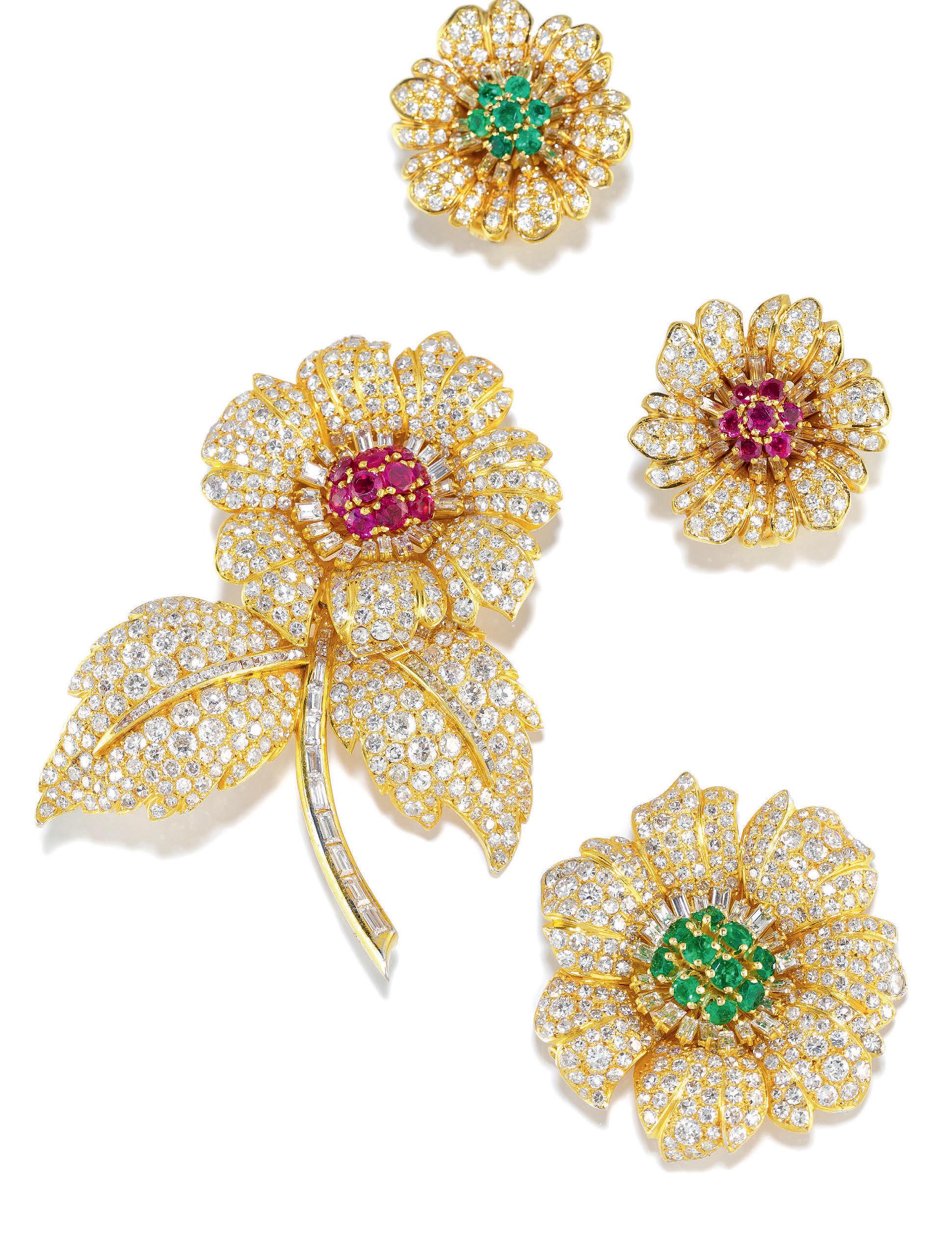 Ensemble composé de deux broches et d'une paire de boucles d'oreilles fleurs or 750 pavées de diamants taille brillant, les pistils