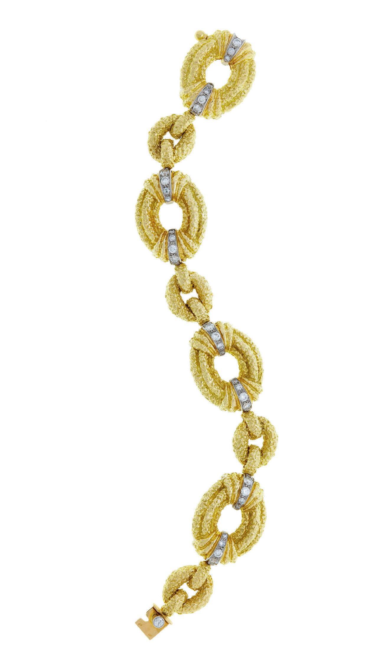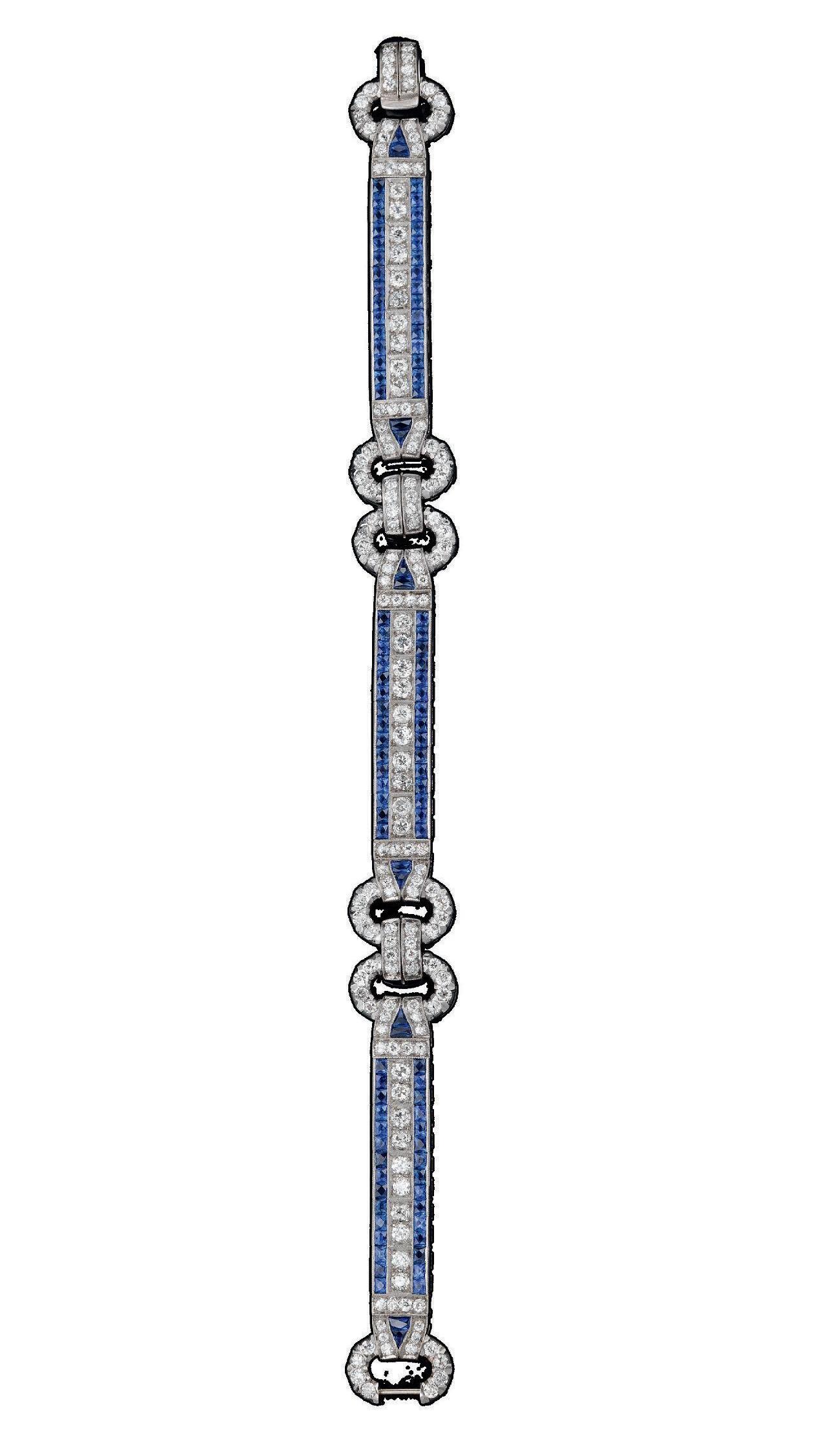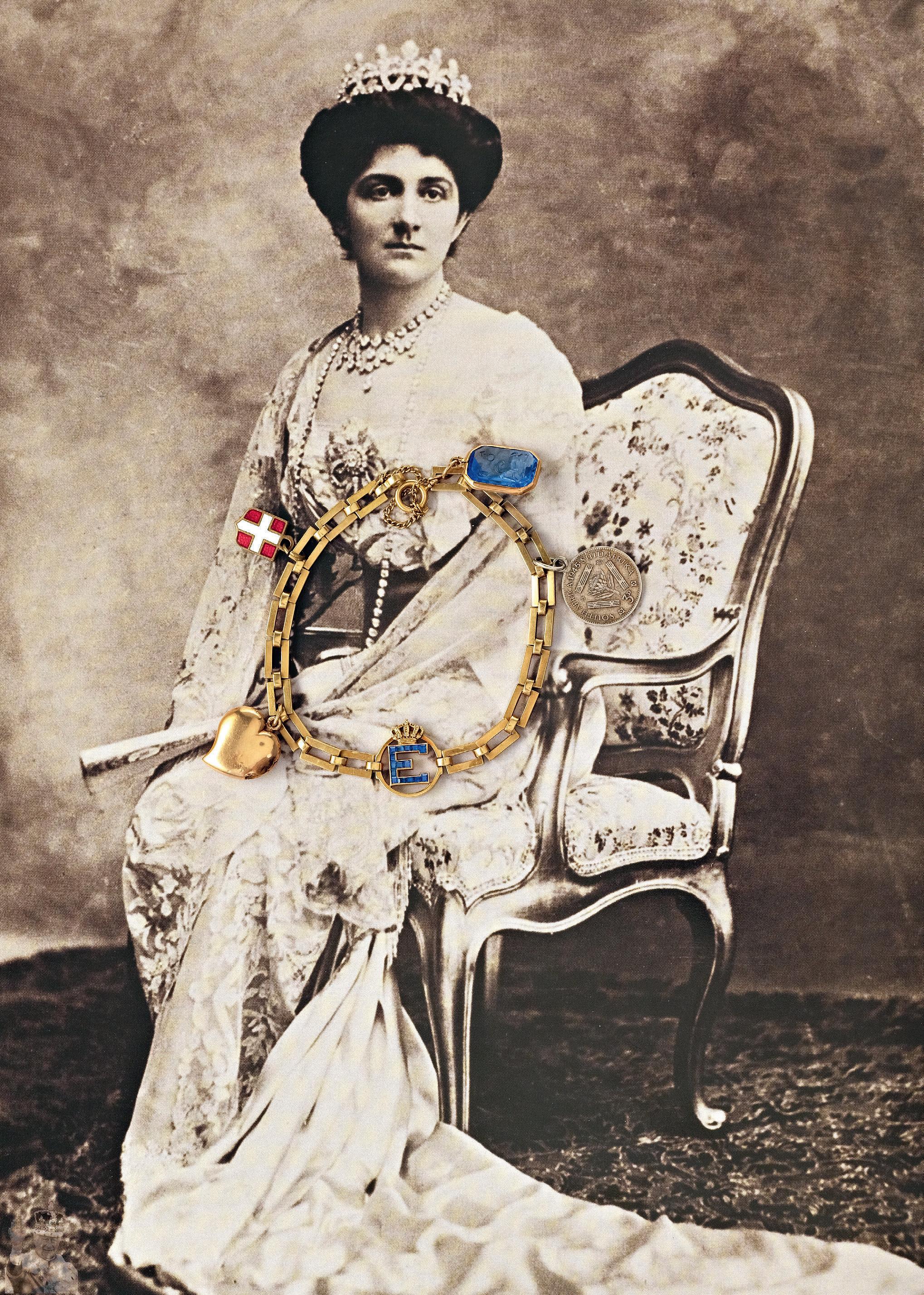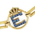 5352 Bracelet en or 750 orné du monogramme couronné d'Hélène de Monténegro Reine d'Italie, serti de saphirs, retenant 4 charms, long. 21 cm, 19g