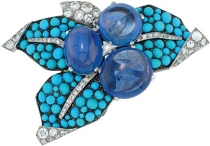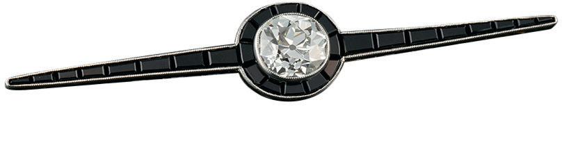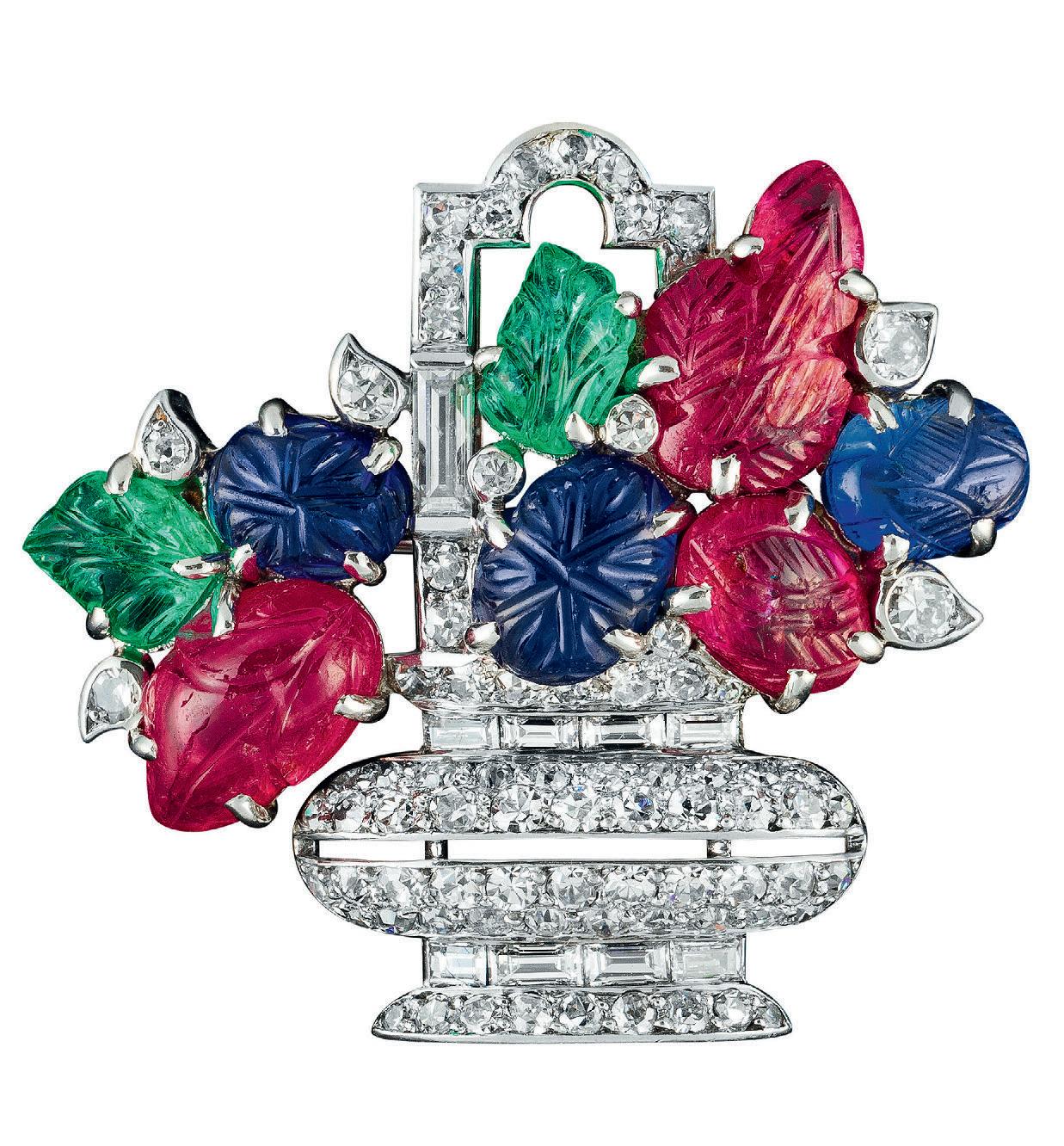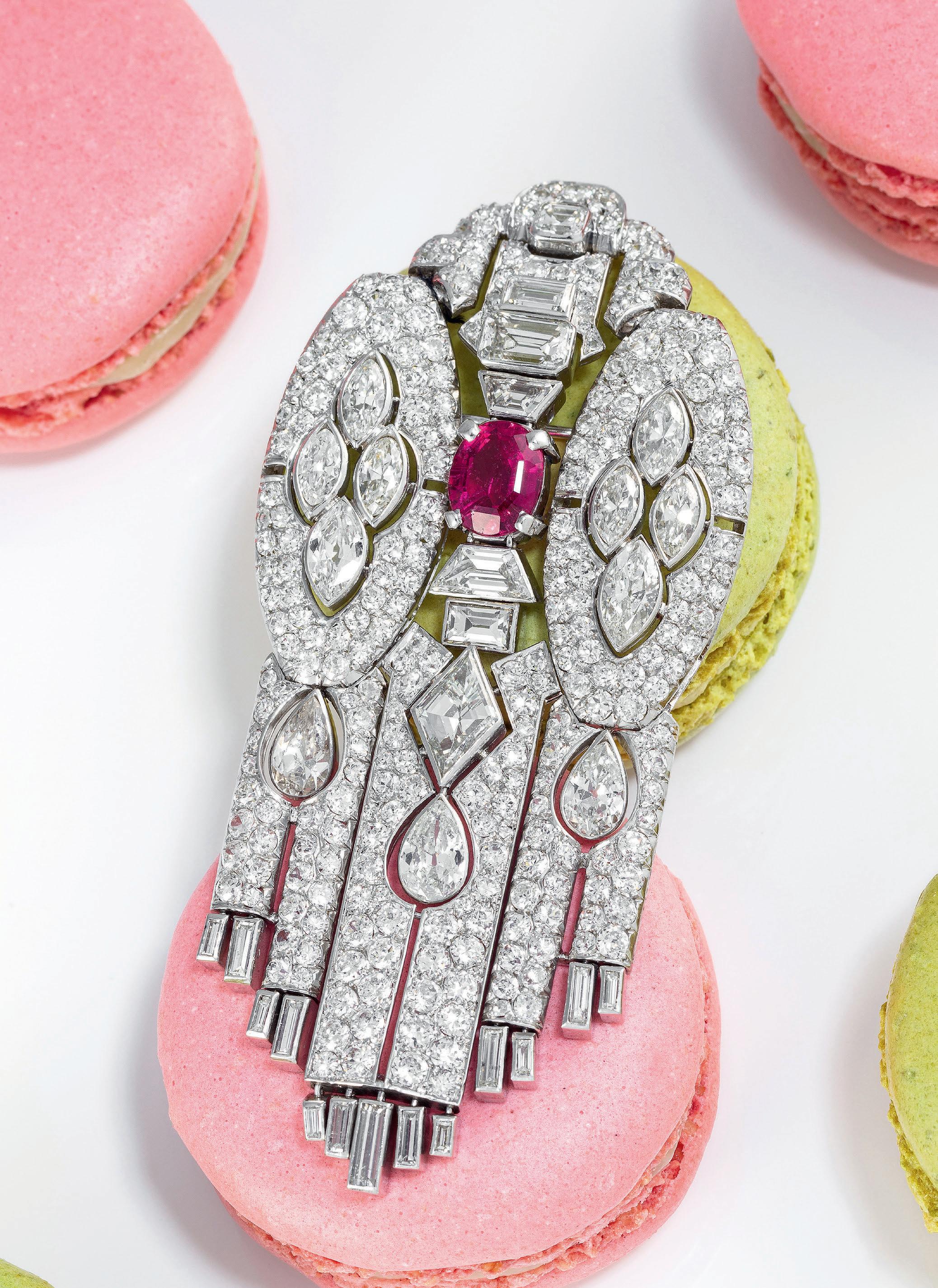 Broche Art Déco platine sertie d'une tourmaline taille ovale, diamants, h. 8.8 cm, 49g 10.000-15.000