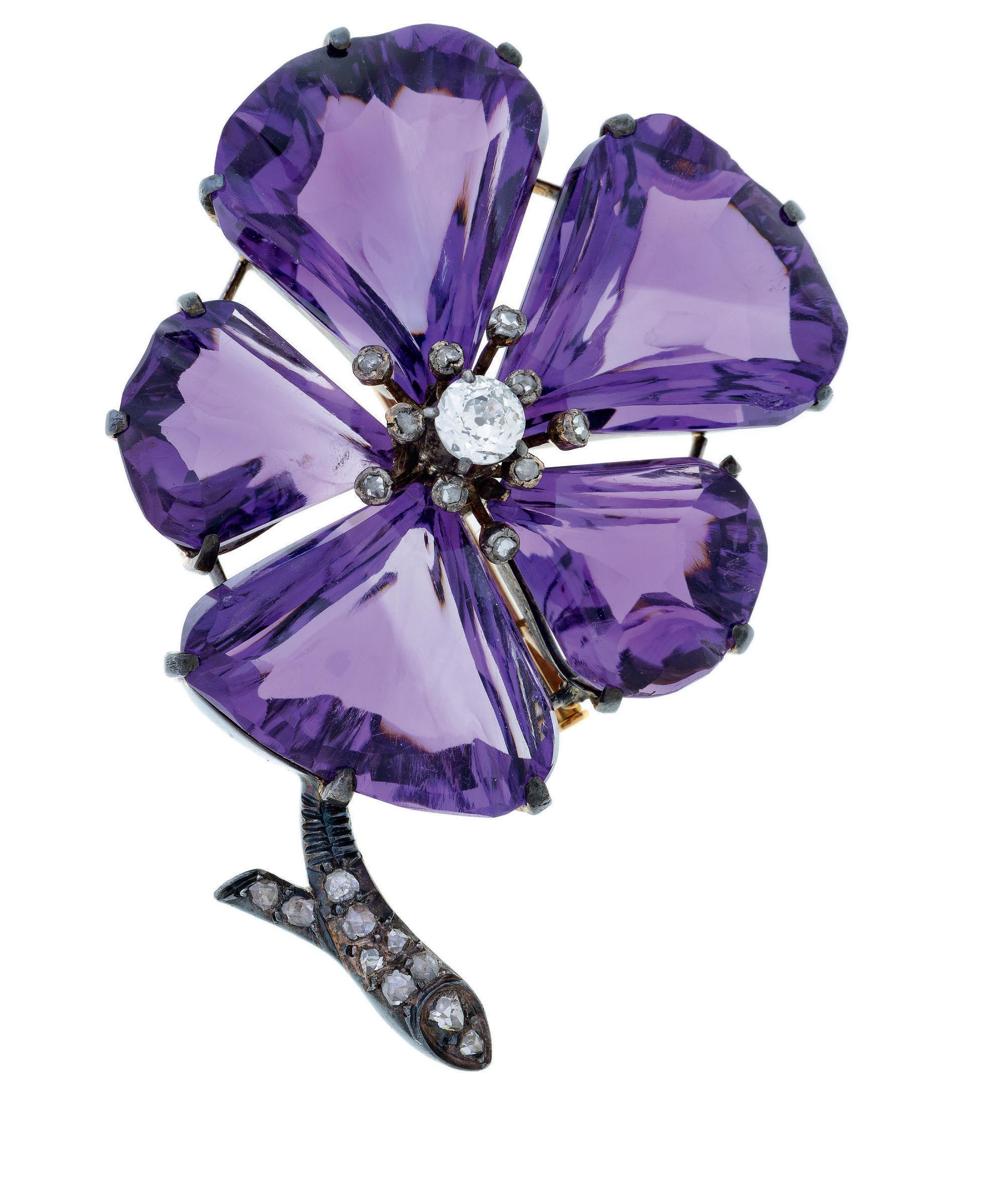 Broche pensée XIXe s., or et argent avec pétales en améthystes gravées et diamants, h. 5.8 cm 1.500-2.000