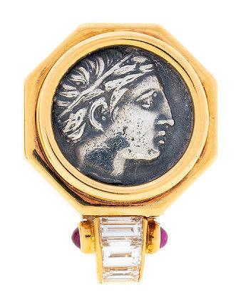 Bulgari, Monete, paire de clips d'oreilles or 750 de forme octogonale ornés de deux cinquième de tétradrachme en argent, royaume de Macédoine, Philippe II (359-336 av. J.C.), diamants et rubis