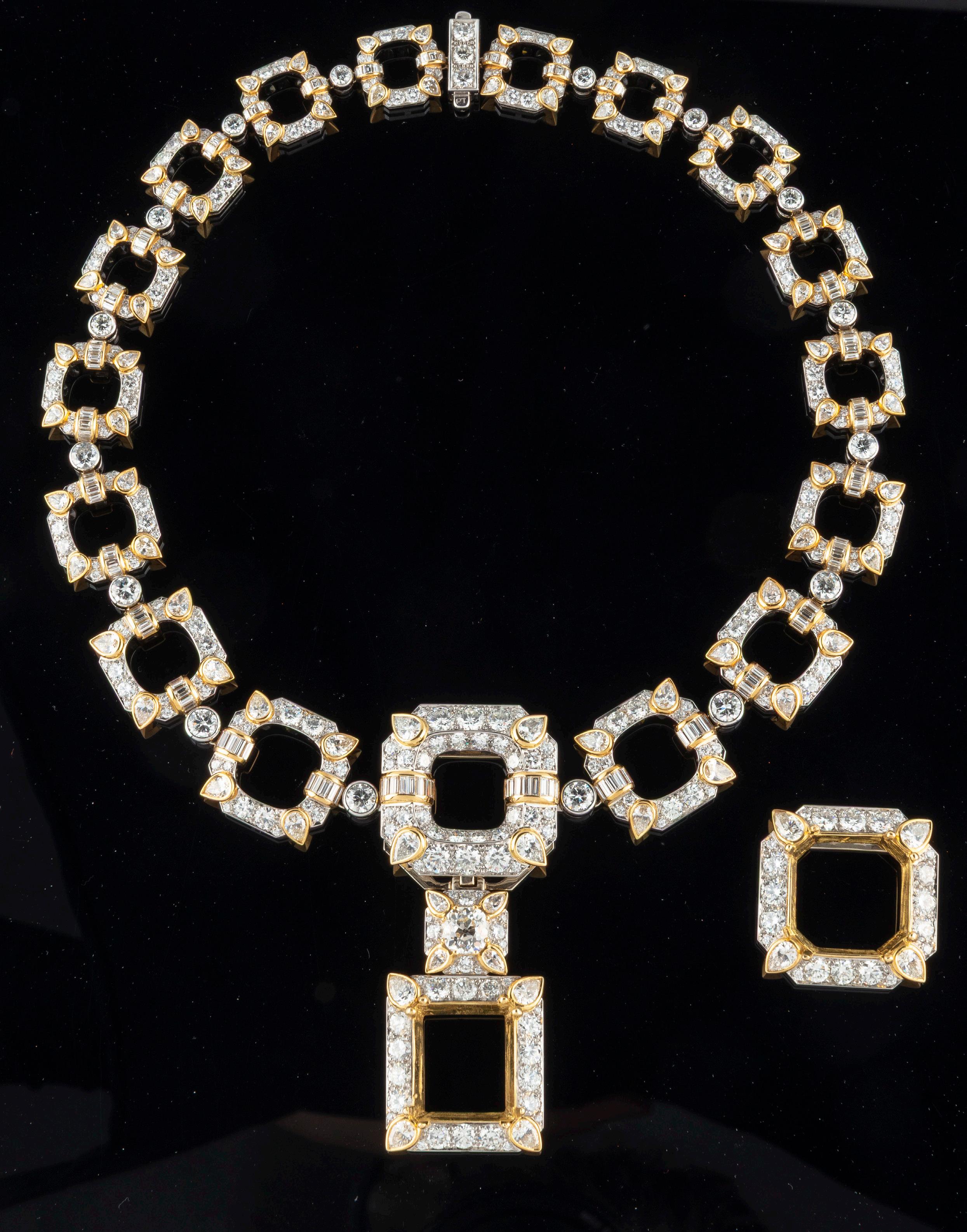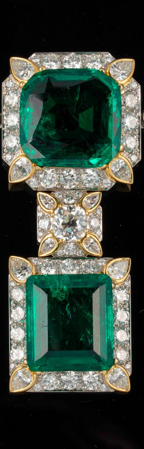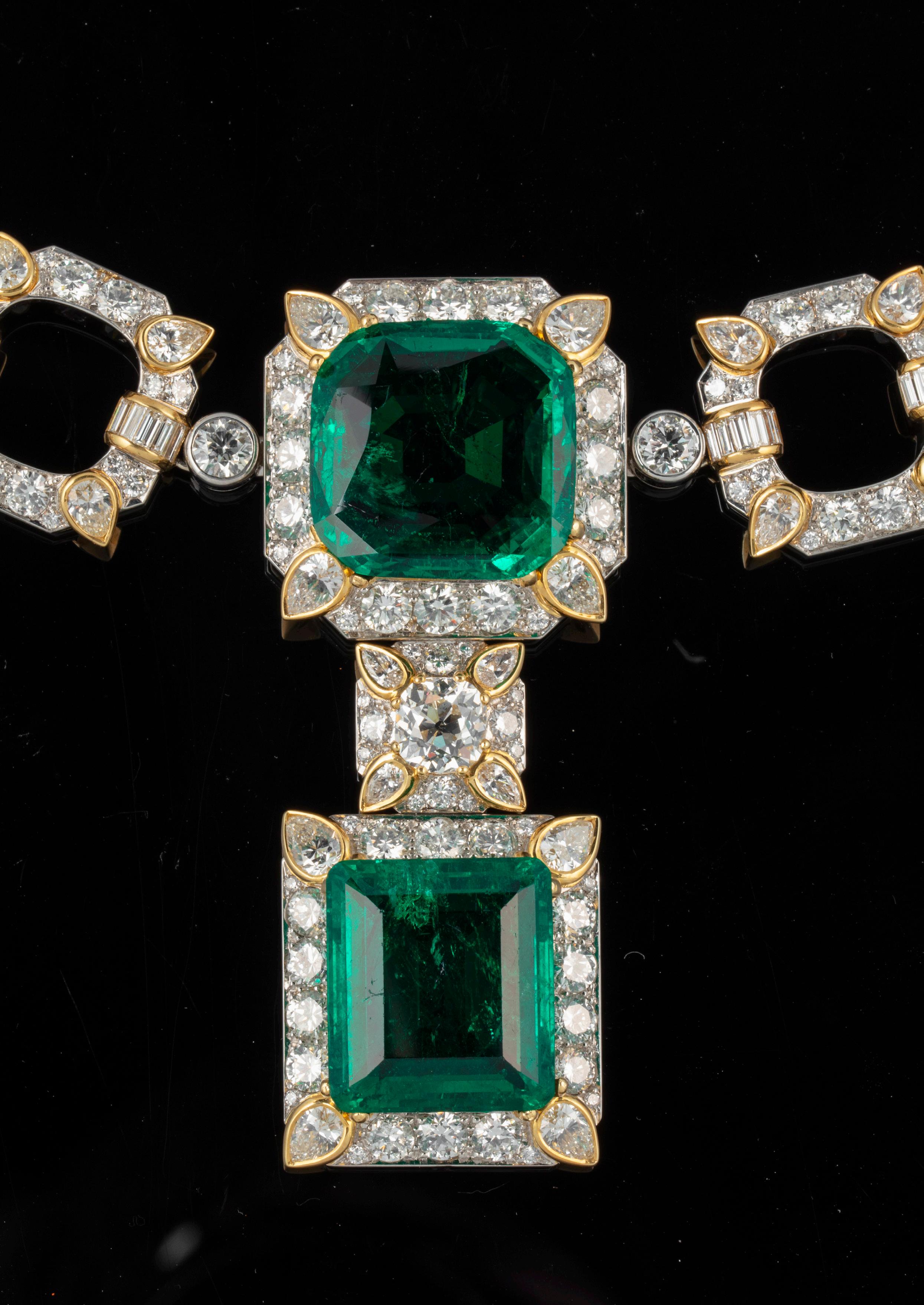 The bespoke setting was crafted approximately 50 years ago and is composed of over 60 carats of diamonds and 236 grams of gold. The emeralds were initially set within the two central, removable elements, one of which could be worn separately as a brooch.