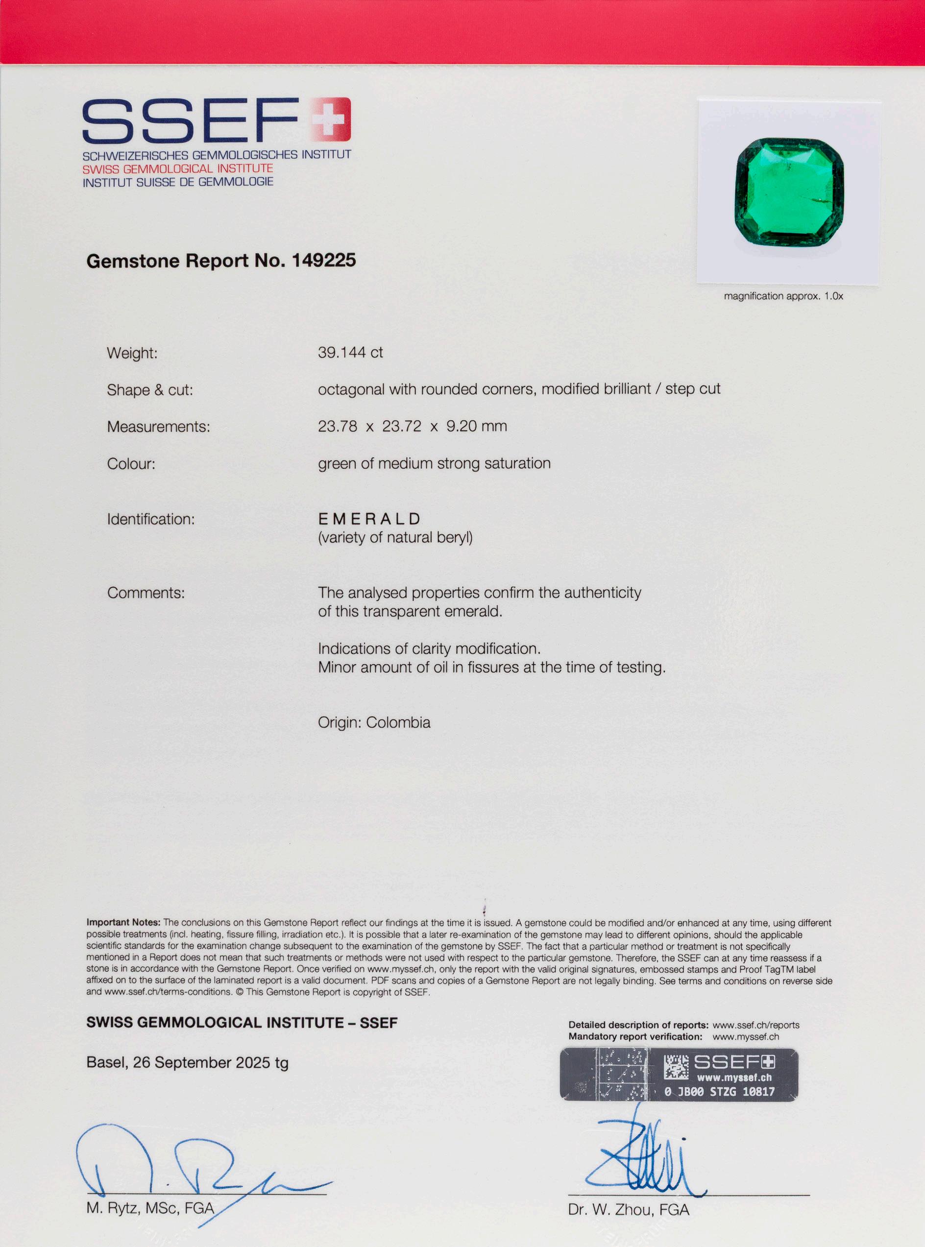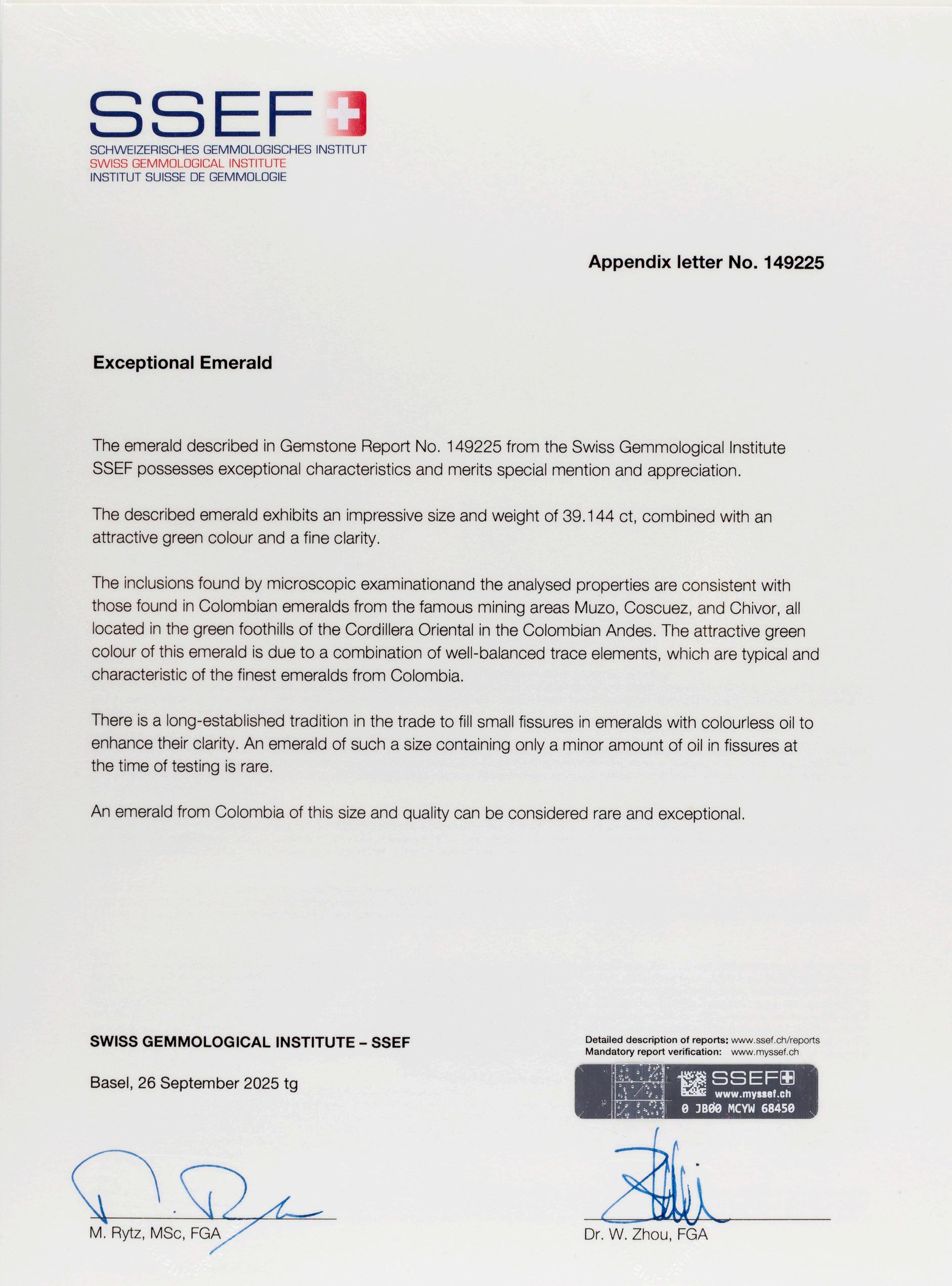 SSEF, 2025, report, n°149225, Emerald : 39.144 ct, Colombia, minor amount of oil in fissures, with an Appendix describing the Emerald as « Exceptional » and Gemmological Profile detailing the origin of the emerald from the most famous mining area. According to the SSEF an emerald of such size and quality, containing only a minor amount of oil in fissures from Colombia can be considered rare and exceptional.