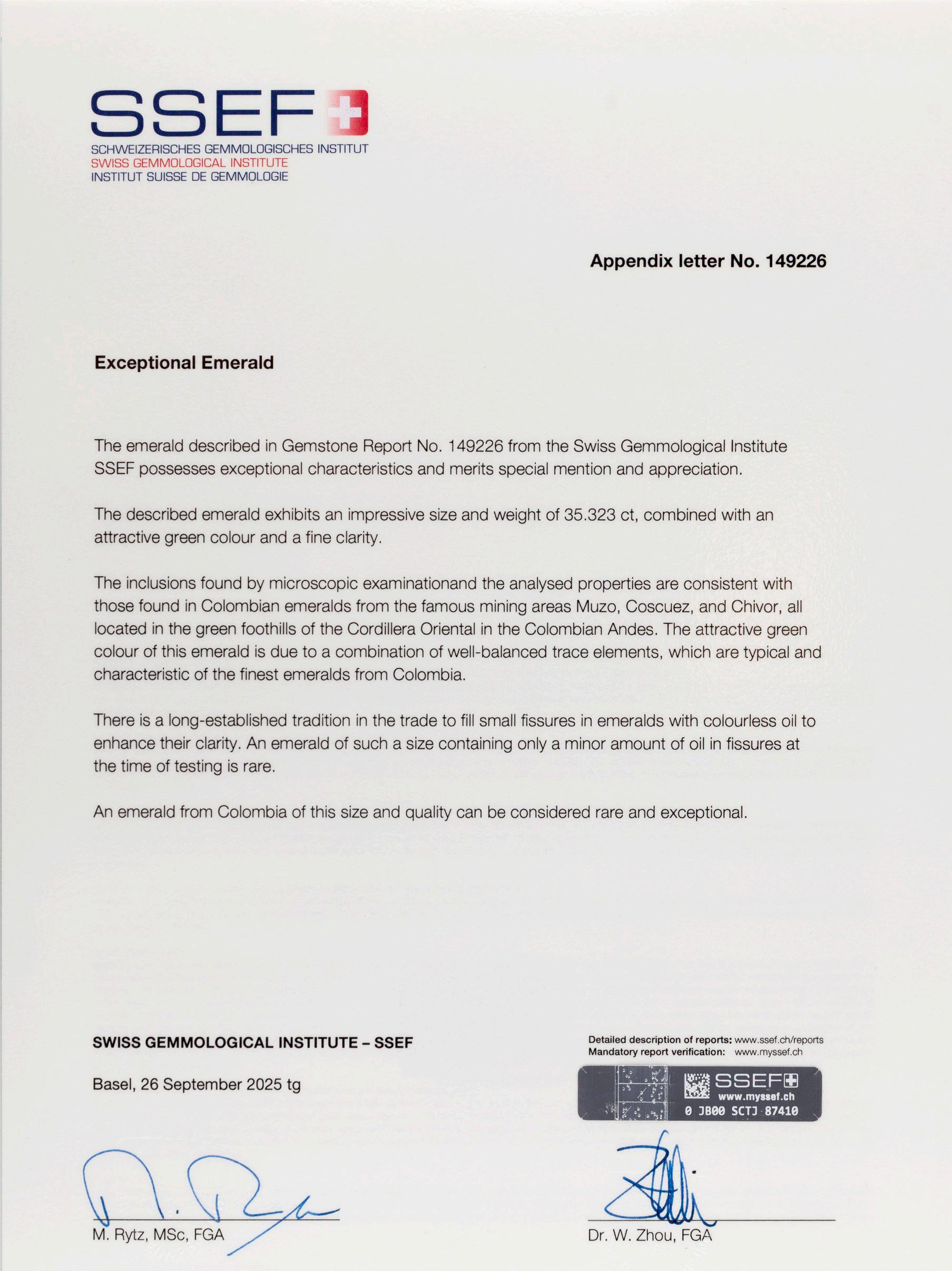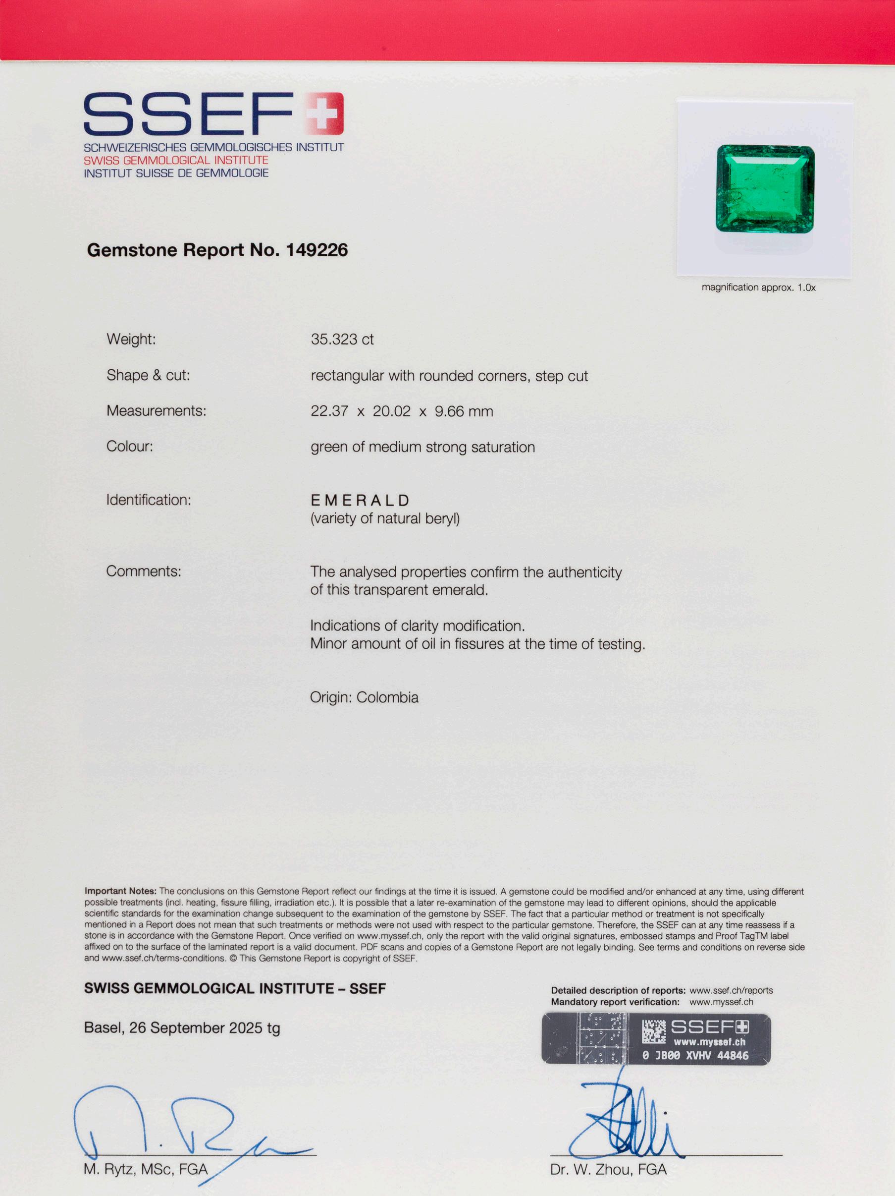 SSEF, 2025, report, n°149226, Emerald : 35.323 ct, Colombia, minor amount of oil in fissures, with an Appendix describing the Emerald as « Exceptional » and Gemmological Profile detailing the origin of the emerald from the most famous mining area. According to the SSEF an emerald of such size and quality, containing only a minor amount of oil in fissures from Colombia can be considered rare and exceptional.