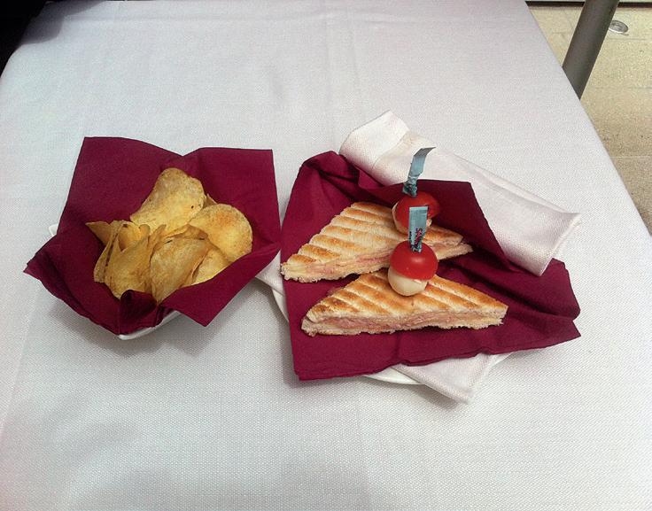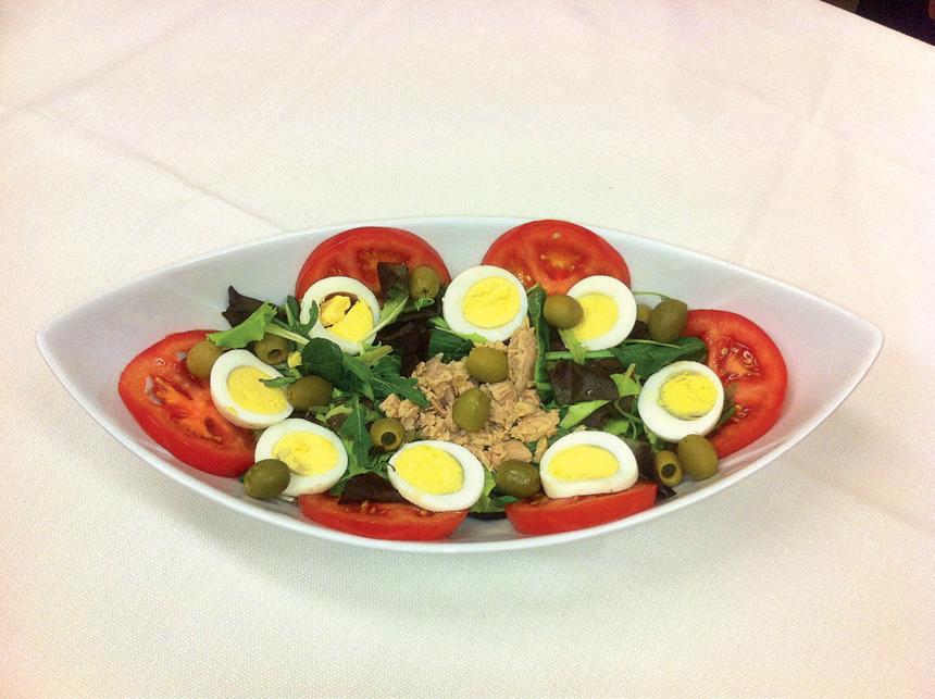 (Green salad, Tomato, Tuna-fish, Olives, Eggs). Served with bread.