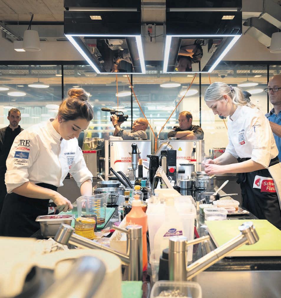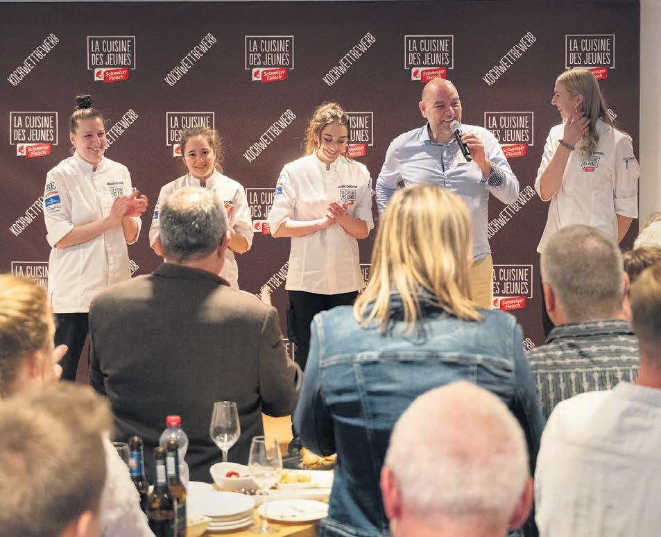 Der Wettbewerb «La Cuisine des Jeunes» von «Schweizer Fleisch» ist immer auch ein Branchentreffpunkt. Fachlehrer unterstützen ehemalige Schülerinnen; Organisatoren und Juroren von Kochwettbewerben halten Ausschau nach Talenten, Sponsoren treffen auf Chefs der Finalistinnen. Auch für die Jungköchinnen war nach getaner Arbeit netzwerken angesagt. Die Vorjahressiegerin Anastasia Mischukova kochte das Festessen. Sie zeigte sich hocherfreut über die Frauenpower der 21. Ausgabe von «La Cuisine des Jeunes».