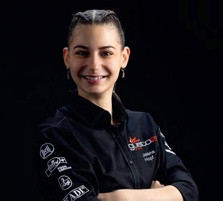 Jelena Hopf aime expérimenter en cuisine. Elle y intègre souvent différentes cultures culinaires, inspirées par des rencontres faites dans sa vie. «Pour moi, la cuisine est un voyage et chaque plat raconte une partie de mon histoire.» Si elle pouvait choisir un super pouvoir de cuisinière, ce serait celui de conserver «des mains calmes dans toutes les situations pour travailler le plus précisément possible». En cuisine, c’est le travail d’équipe qui compte pour la jeune femme de 18 ans. «J’aime rire et j’apprécie dans mon équipe de pouvoir travailler avec des gens de bonne humeur.»