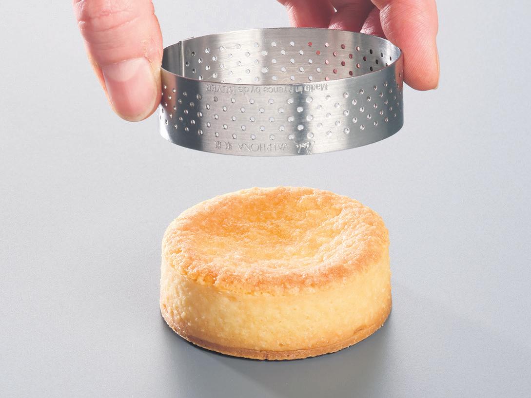 Tartelettes auslegen Mürbeteig 1,8 mm dick ausrollen. Bänder (2 × 20 cm) zuschneiden und den Ring (gelochte Ringform 6,6 cm × 2 cm Ø) damit auslegen (Bild 1). Anschliessend mit dem Ring den Boden ausstechen. Pro Törtchen 35 g Franchipan-Masse in unge backene Mürbteigböden einfüllen und anschliessend backen.