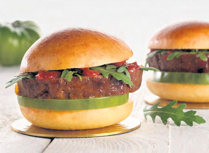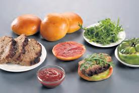 Burger füllen Brötchen quer halbieren und beidseitig mit je 15 Gramm HimbeerTomaten-Ketchup bestreichen. Mit 30 Gramm Tomatenscheiben, einer Tranche warmem Hackbraten à 70 Gramm und drei Gramm Rucola belegen (Bild 3).