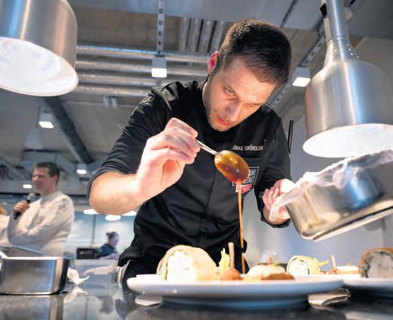 louté de beurre noisette, de dim sums et de poireaux, le chef de partie du restaurant The Japanese by The Chedi à Andermatt (UR) a séduit le jury. Ce dernier, présidé par Christoph Hunziker, chef et patron du SchüpbergBeizli à Schüpfen (BE) n’a pas eu la t âche facile. Pascal Melliger, du restaurant Wein & Sein à Berne, et Christian Aeby, du Restaurant du Bourg à Bienne (BE), ont tous deux souligné l’excellente préparation des finalistes. De son côté, Alexandra Müller, du comité des Jeunes Restaurateurs d’Europe en Suisse (JRE), a relevé l’importance du goût, «qui fait tout», et ce d’autant que l’aspect visuel de toutes les créations a été salué. Distancée de quelques points seulement, Martina Burri, commise de cuisine au