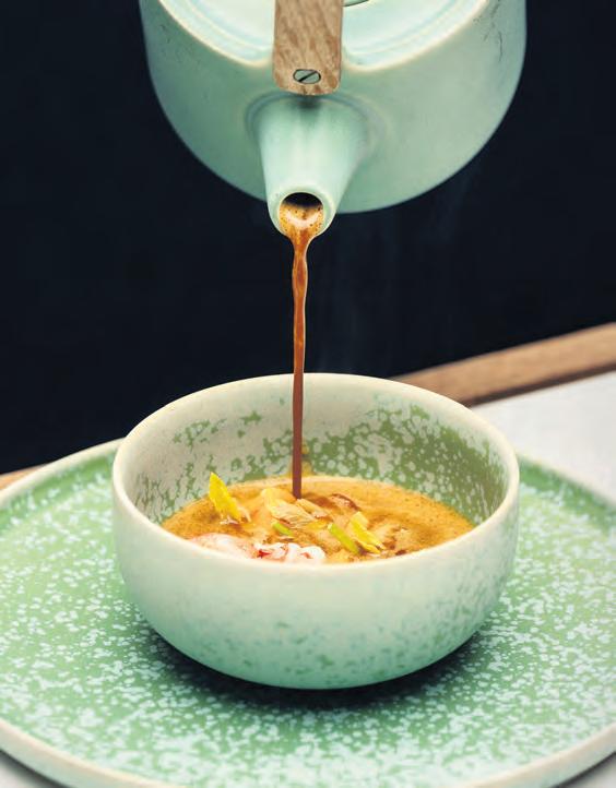 distincts – asiatique, végétal ou hommage à Berlin –, mais aussi dans ses t rois brasseries de Berlin, Munich et Constance, ses quatre restaurants à bord des bateaux de croisière TUI. Et bientôt, à partir de 2025, un nouveau site s’y ajoutera, dominant la métropole: un nid d’aigle dans la Tour 32 des Télécoms, qui abrite plusieurs stations télé et radio sur ses 360 mètres de hauteur. Il y sera à pied d’œuvre, pourrait-on dire, pour les multiples apparitions médiatiques dont il est coutumier. Ultra médiatisé, remarié à Katharina Wolschner, rédactrice en chef du magazine gastronomique Rolling Pin, Tim Raue apparaît régulièrement dans des émissions, séries télévisées et autres shows tels Kitchen Impossible, Star Kitchen ou Undercover