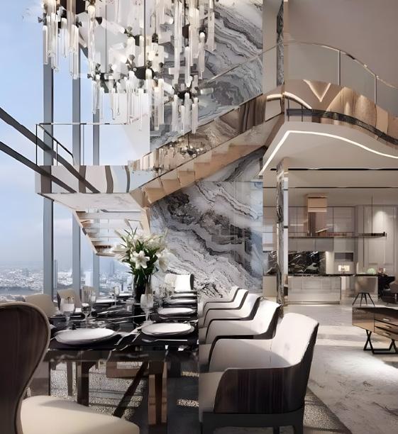 Situated high above the vibrant heart of Bangkok, within the prestigious Canapaya Residences, this zenith of luxury spans the 56th and 57th floors. This remarkable 900 sqm space presents a rare opportunity to customize a residence of six bedrooms and eight bathrooms, with the majestic Chao Phraya River as your backdrop.