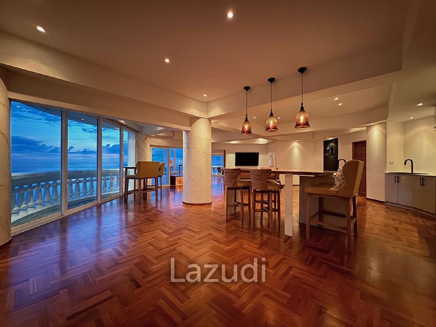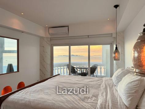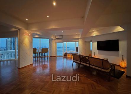 Experience the epitome of beachfront luxury in this 29th-floor, 175 sqm condominium in Wongamat, Pattaya, boasting panoramic views of the sea, city, and mountains. The residence features a fully renovated open-concept living area with three balconies that blur the lines between indoor elegance and outdoor beauty, especially from the master bedroom with its serene seascape.