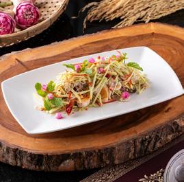 dipped in egg and fried. Stuffed Red Chili is made with snakehead fish meat with sliced, dried chilis deep-fried to perfection. Stuffed Green Pepper features a mix of shrimp and chicken stuffed into a green pepper, wrapped in a delicate crispy shredded egg. As the perfect palette pleaser, Jim Thompson’s signature “Mango Sticky Rice” is served as the finishing touch.