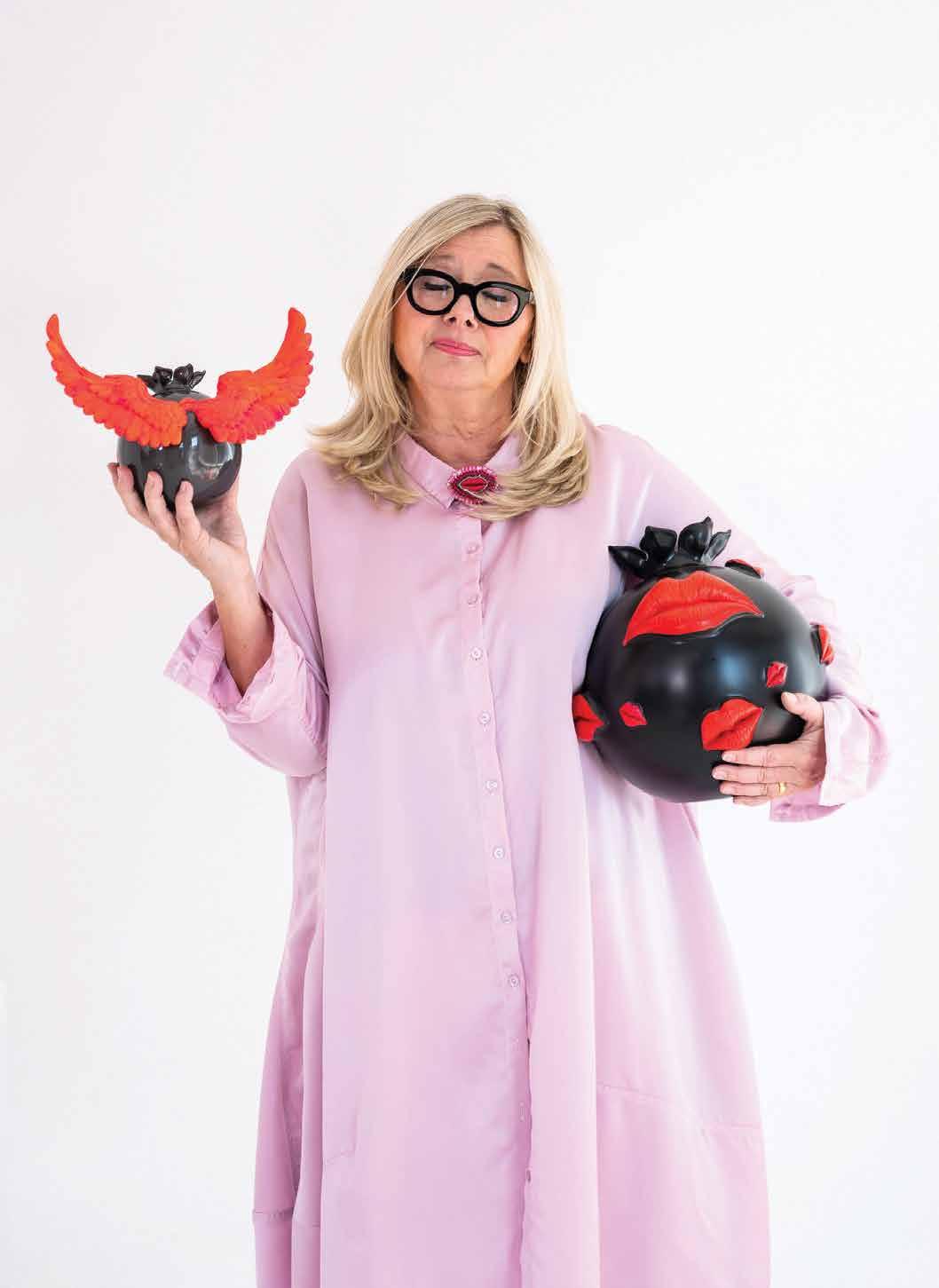We’re talking about her sculpture series, Everybody’s Darling, a colourful, playful and, above all, joyful interpretation of the pomegranate fruit. “The starting point for the sculpture series was a painting, Falling in Love, which I created in 2021. In this work I painted a pomegranate as a love-dispensing symbol for the first time – serving as a visual carrier of love, hope, and connection. Initially, my intention was to develop this idea into a series of paintings. But as the artistic process evolved it became increasingly clear that this motif called for greater space and presence. Out of this realisation, the sculpture emerged as a three-dimensional translation of the love-dispensing pomegranate.”
