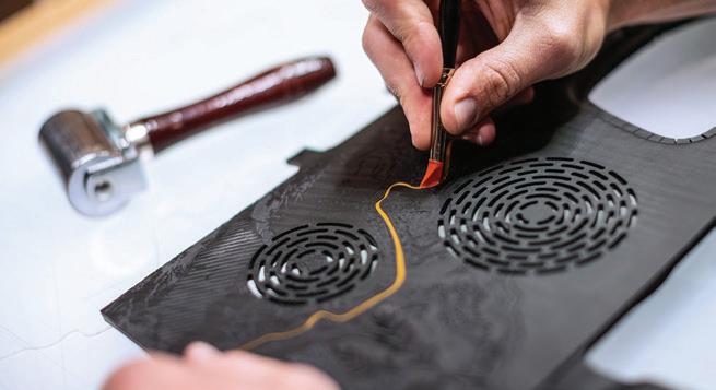These pages: elements of the craftsmanship employed in the car’s interior, including embroidery, gold leafing, and 3D marquetry and ink layering