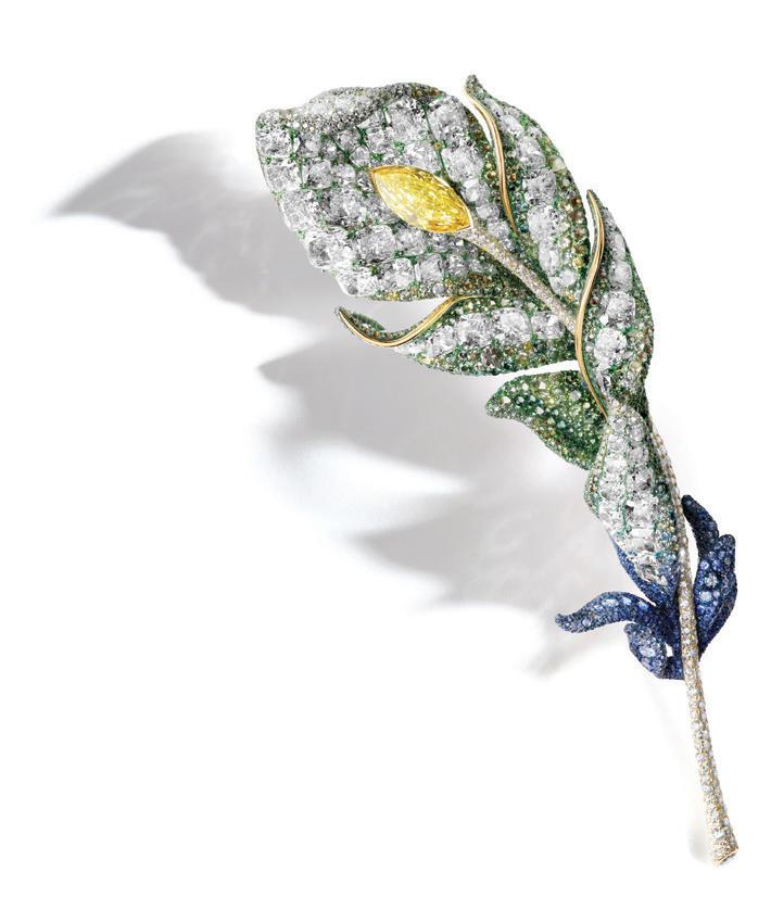 Chao has turned to the feather again, showcasing her extraordinary skill at making objects lifelike through her innate understanding of layers, light and shadows. This diamond and titanium brooch features 3,693 gemstones in all, with a total carat count of 78.51.
