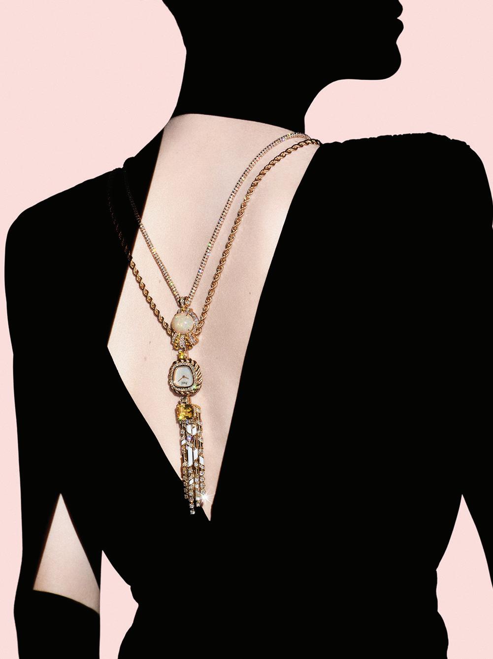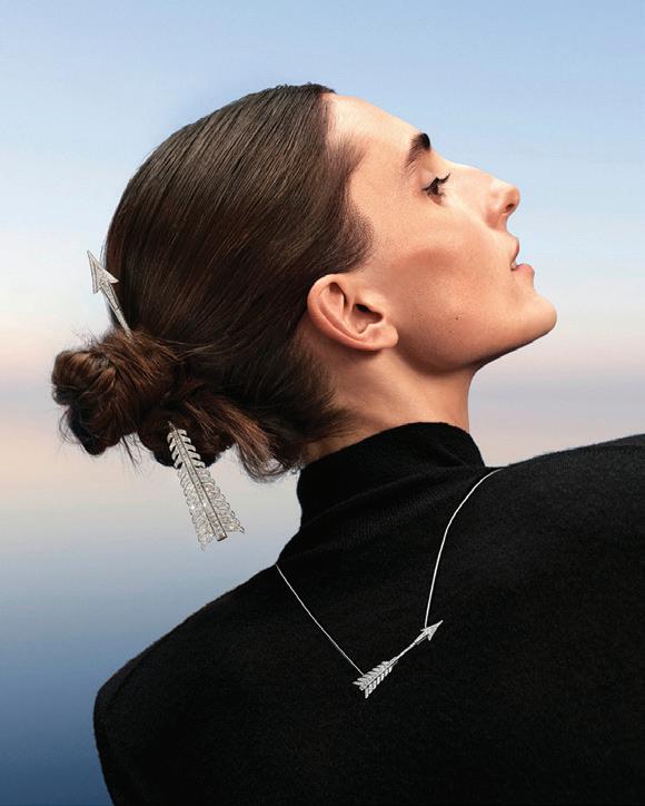 modern orientalism to Art Deco. Drawing the arrow once again, Boucheron’s current creative director, Claire Choisne, has created eight diamond-laced original designs, including this pendant and extralarge brooch which, as shown, can be worn in multiple ways.