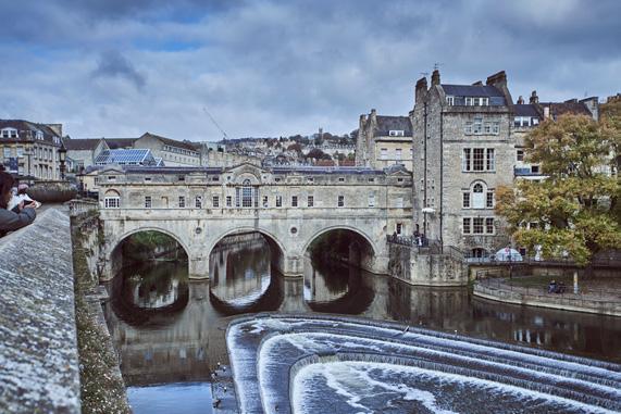 wood panelling receives the finest French polish, applied by skilled artisans from a firm that was established in 1884. This is a train steeped in tradition. Settled very comfortably into our carriage – the beautifully attired Minerva, which dates to 1927 – dreary Victoria grows ever distant by the time we’re handed a sprightly Bellini at the start of the onboard silver service, kickstarting a daytrip to the beautiful city of Bath, the only city in the UK to be designated a World Heritage Site in its entirety. By the time the train has rolled past Edwardian-era houses, quaint little villages, meandering rivers, steep valleys,