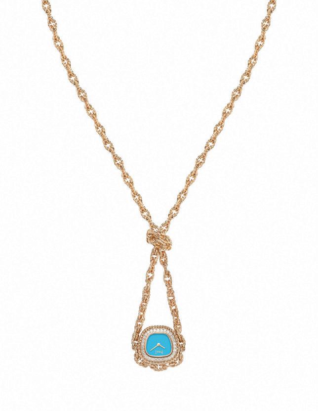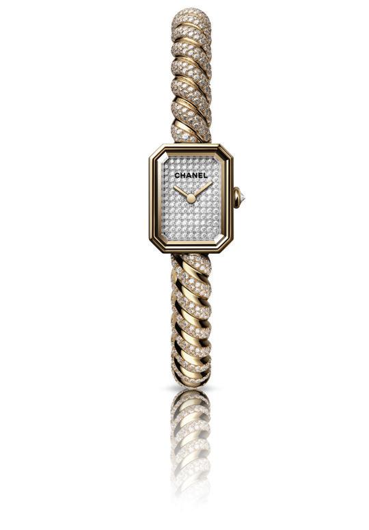 bracelet adapted from the leather chain on the signature quilted bag. For this latest iteration of the watch, the Chanel braid is the source of design inspiration, effecting a twisted 18-carat yellow gold bracelet set with 573 brilliant-cut diamonds.