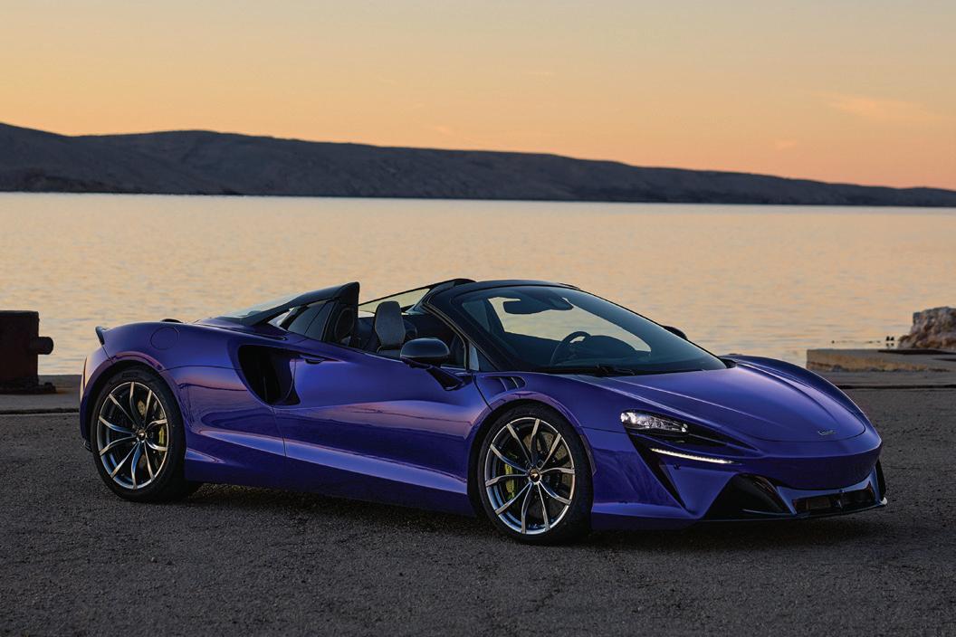 safe in the knowledge that it’s ready and waiting for you to fire up the cylinders when you hit the (occasionally) open road. Care in the community aside, the main job of electric motors in this car is to complement the petrol engine and provide rapid acceleration with incredible throttle response. When you want to turn on the taps and let the Artura Spider sing, McLaren has upped the drama with a greater crescendo of sound provided by a revised exhaust design. There’s also an optional sports exhaust for those who want the maximum difference between electric and combustion sounds. The result: a supercar that is by no means the fastest in the market (although 609bhp, 3 seconds to 100km/h and a top speed of 330km/h is ample in anyone’s books), but probably one of the quickest from A to B. The power combination undoubtedly contributes to this, but it’s the sum of the Artura Spider’s parts that make this model such an absorbing proposition. McLaren’s sublime hydraulic steering is matched with its trademark low scuttle, offering fantastic sight lines out of the
