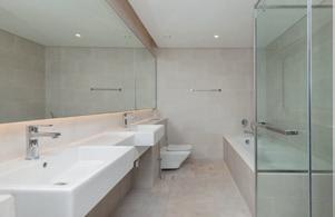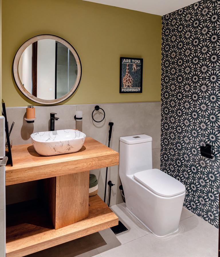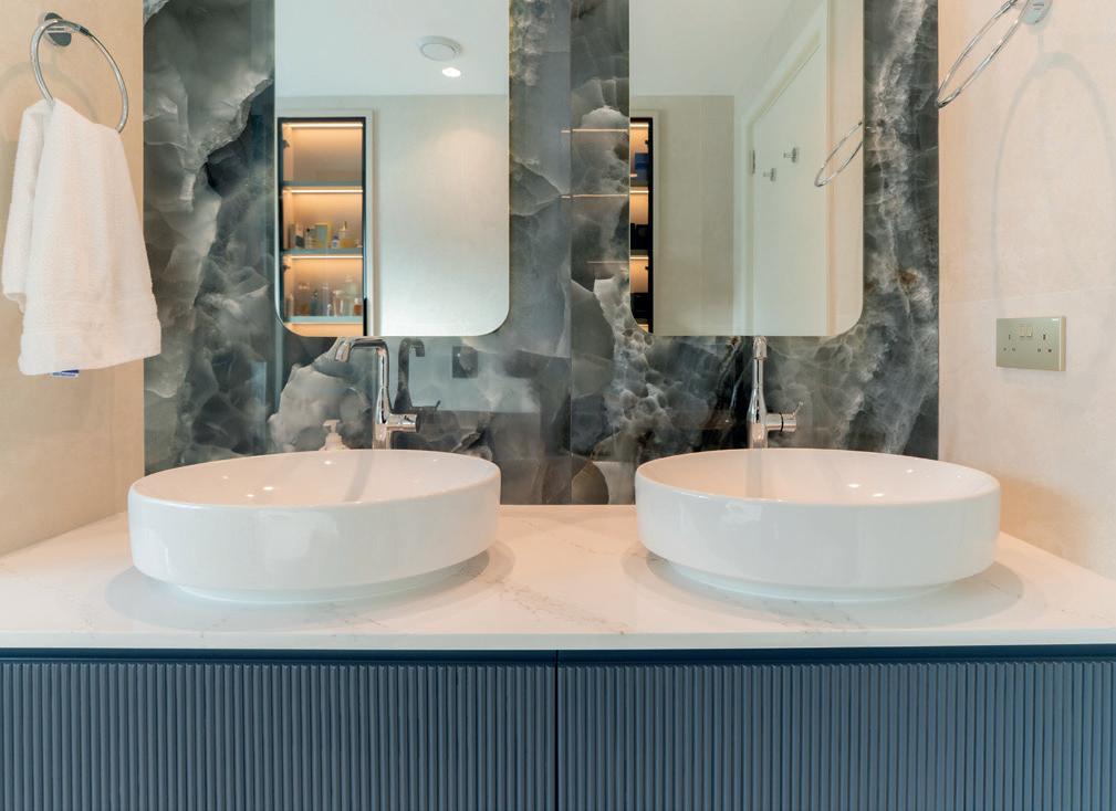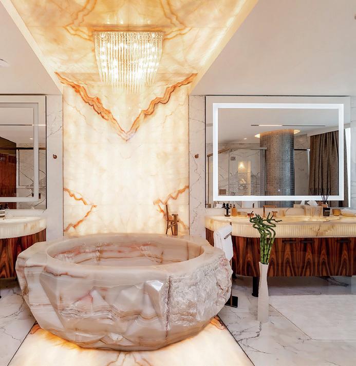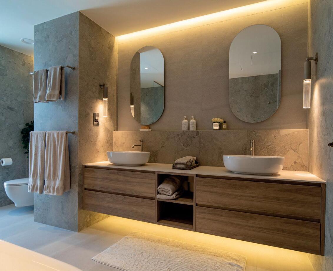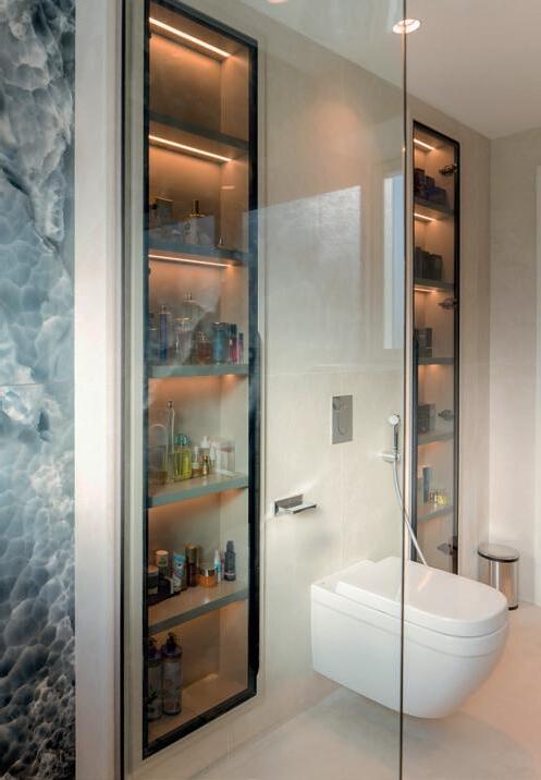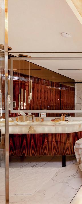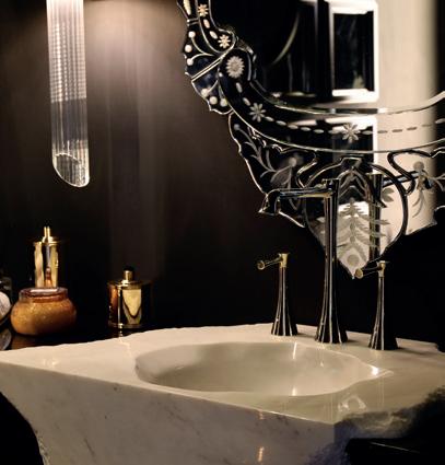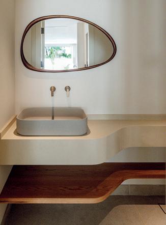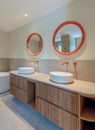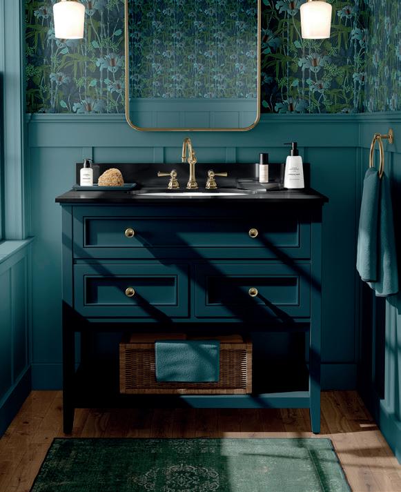 Bold colour continues its ascent with colour drenching absolutely en vogue. An allencompassing, immersive approach where a single hue covers walls, ceiling and trim, this is in direct contrast to the crisp whites and backdrop canvas neutrals that traditionally enter bathroom territory. Instead, with immersive colour you are enveloped in an ambience that feels intentional and cocooning. By eliminating visual breaks, colour drenching enhances spatial context and can even make the tiniest bathroom appear larger. Colour-wise, warm terracotta, olive green and mushroom-based neutrals deliver a grounded, natural calm; dusky rose and muted blue bring softness and depth; while saturated jewel tones offer unapologetic drama. Whether subtle or striking, the monochromatic effect creates a mood-rich environment where colour becomes the defining motif.