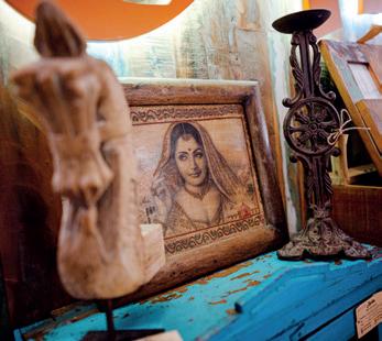 Clockwise from top: Art Deco vase, green velvet screen, Art Deco ceiling lamp, cabinetofcuriosity. me; Painting in frame, antikadubai.com; Chest of drawers, labrocante.ae; modern Najdi table, Mother-of-pearl inlaid chair, original-antique. com; hand carved mirror, antikadubai.com