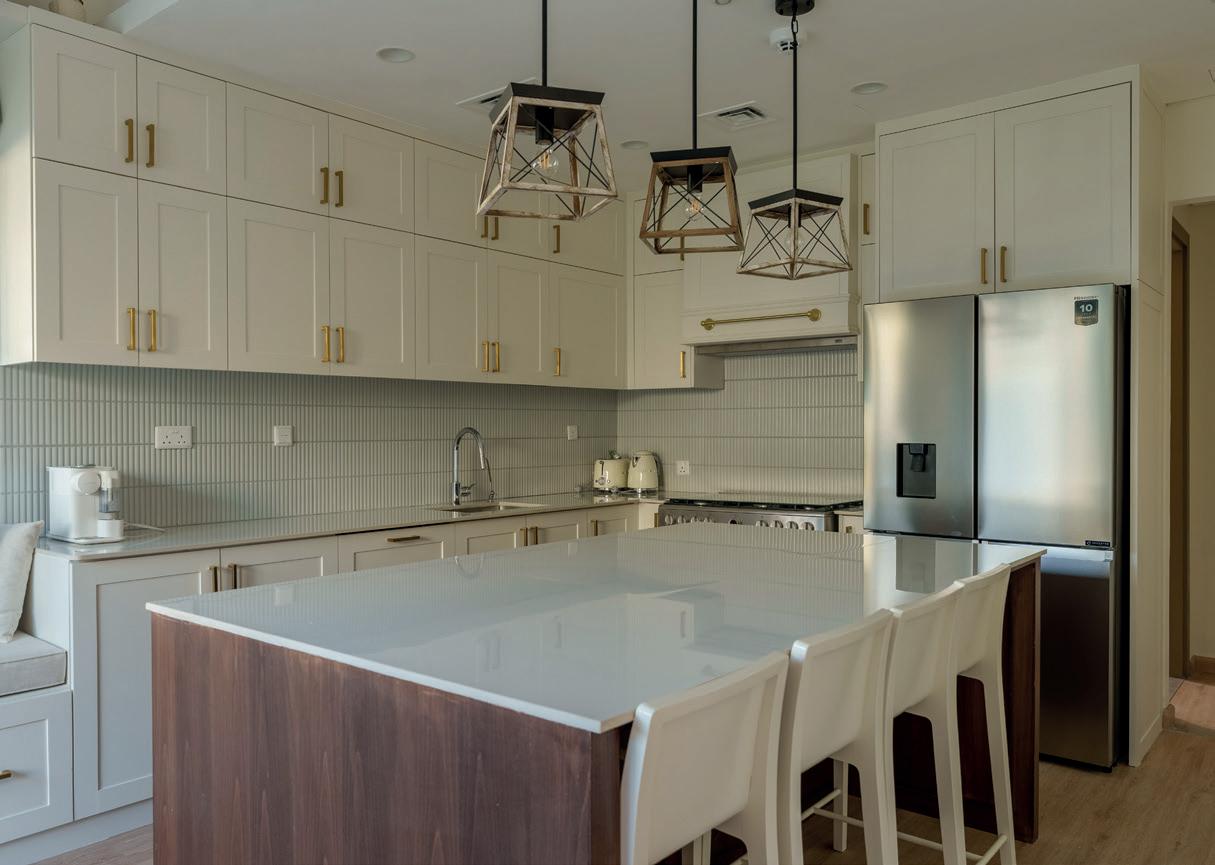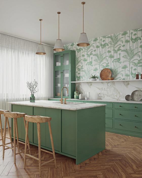 Colour is stepping confidently back into the kitchen, with the year ahead favouring warmth, richness and bold expression. Earth-based neutrals - taupe, mushroom, beige – offer an inviting, grounded backdrop that complements natural materials and subtle textures. These tones are being balanced with deeper, natureinspired shades like forest green, terracotta and smoky mineral hues for a palette that is both modern and enduring. Designers are also exploring bolder moves: saturated burgundy, deep navy, sunlit yellow and even soft pastels introduced as accent tones or statement presentations. Two-tone cabinetry is especially prominent, with perimeter units in one shade and the island or upper cabinets in another to add dimension and character. The overall effect is a kitchen that feels both trend-forward and deeply personal.