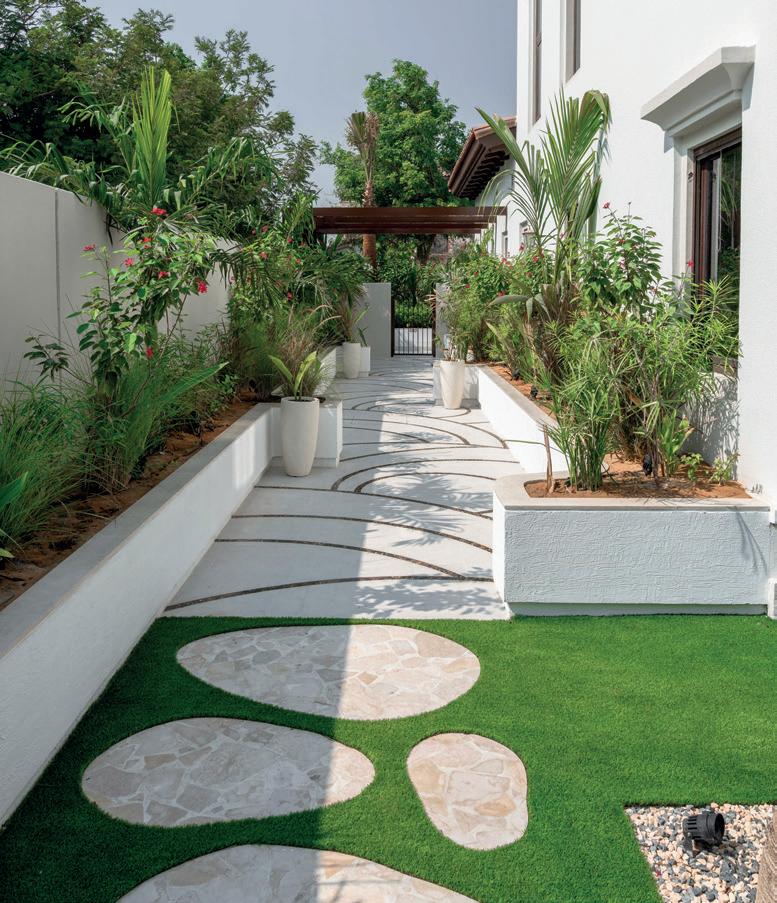 Greenery is transformative, especially when layered at different heights and textures. Mix ceramic, concrete, and rattan planters, and pair evergreens with flowering species. In the UAE, olive trees, bougainvillea, ficus, and jasmine thrive in a desert climate. For cooler months, a fire pit extends outdoor living, while artwork, mirrors, and sculptural pieces bring personality, ensuring the space feels curated rather than staged.