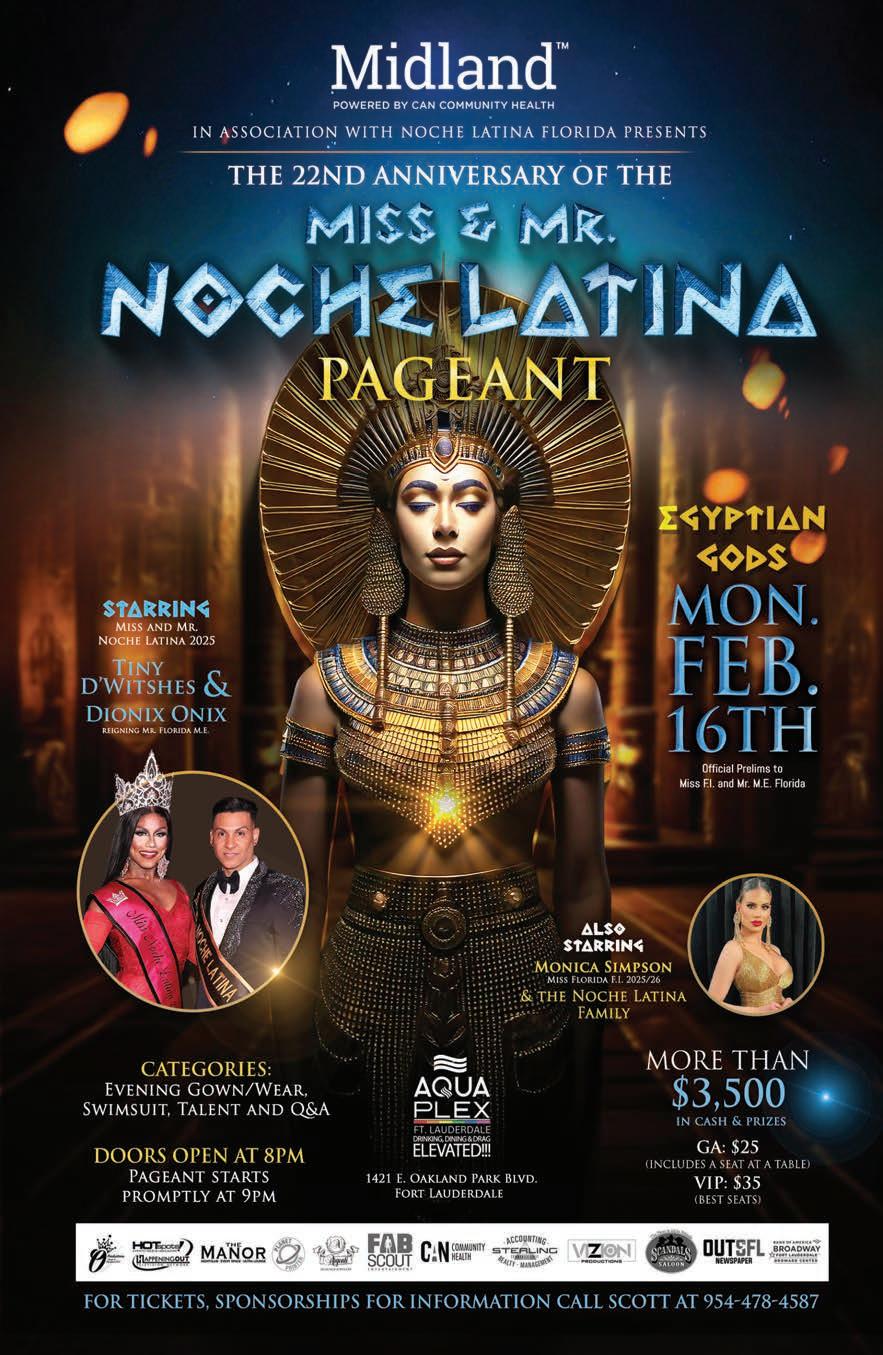 Midland Medical in association with Noche Latina Florida presents the 22nd annual Miss and Mr. Noche Latina Pageant with a “Egyptian Gods” theme taking place at Aquaplex Fort Lauderdale on Monday, February 16 with doors opening at 8pm. The pageant will star the current Noche Court: Tiny D’Witshes, and Dionix Onix (who went on to win the title of Mr. Florida M.E.), Miss Florida Monica Simpson as well as the Noche Latina Family. For more information, Sponsorship, or to purchase tickets call Scott at 954-478-4587.