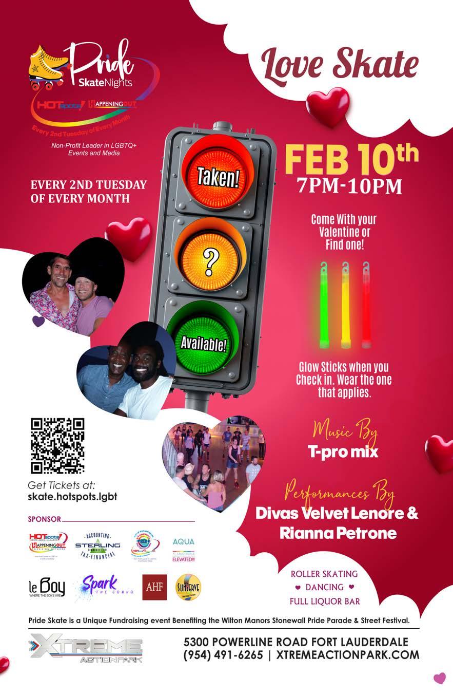 Dangerous World Tour. Created by Tony Award-winning Director/Choreographer Christopher Wheeldon and two-time Pulitzer Prize winner Lynn Nottage, MJ goes beyond the singular moves and signature sound of the star, offering a rare look at the creative mind and collaborative spirit that catapulted Michael Jackson into legendary status. It’s thrilling sold out crowds on Broadway, in cities across North America; London’s West End; Hamburg, Germany; and Sydney, Australia…and now MJ is startin’ somethin’ in West Palm Beach, FL as it makes its premiere at the Kravis Center in February 2026. To purchase tickets, go to Kravis.org Tonight is the monthly Pride Skate, with the theme “LOVE SKATE,” where they invite you to come with your Valentine or come and find one. You will get Glow Sticks when you check in, and where the color that applies (RED = Taken, GREEN = Available, and YELLOW = ?). Pride skate is the 2nd