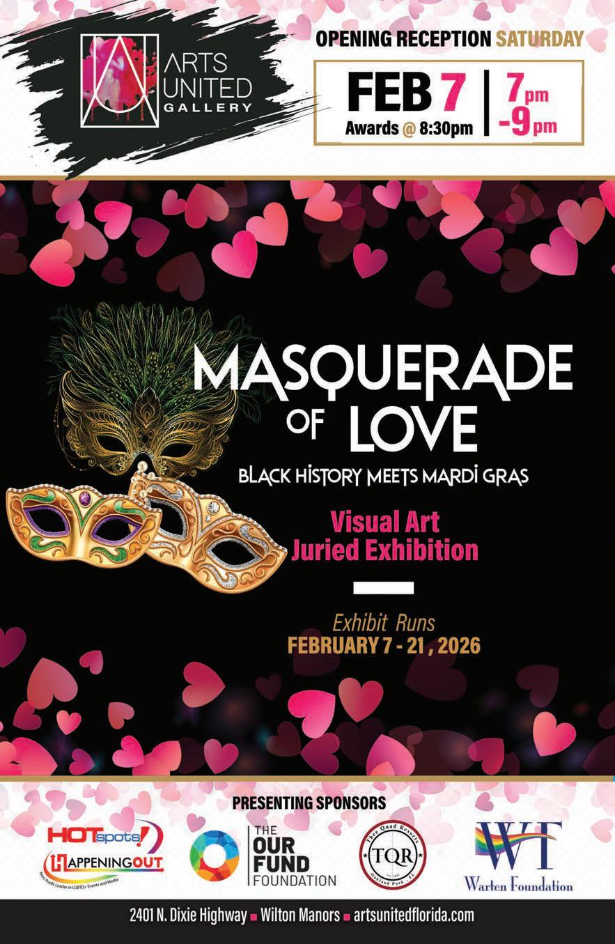 casino.hardrock.com/hollywood/events Arts United Gallery presents the opening reception for “Masquerade of Love: Black History Meets Mardi Gras” visual art juried exhibition from 7 to 9pm with the awards at 8:30pm. For more info go to Artunitedflorida.com