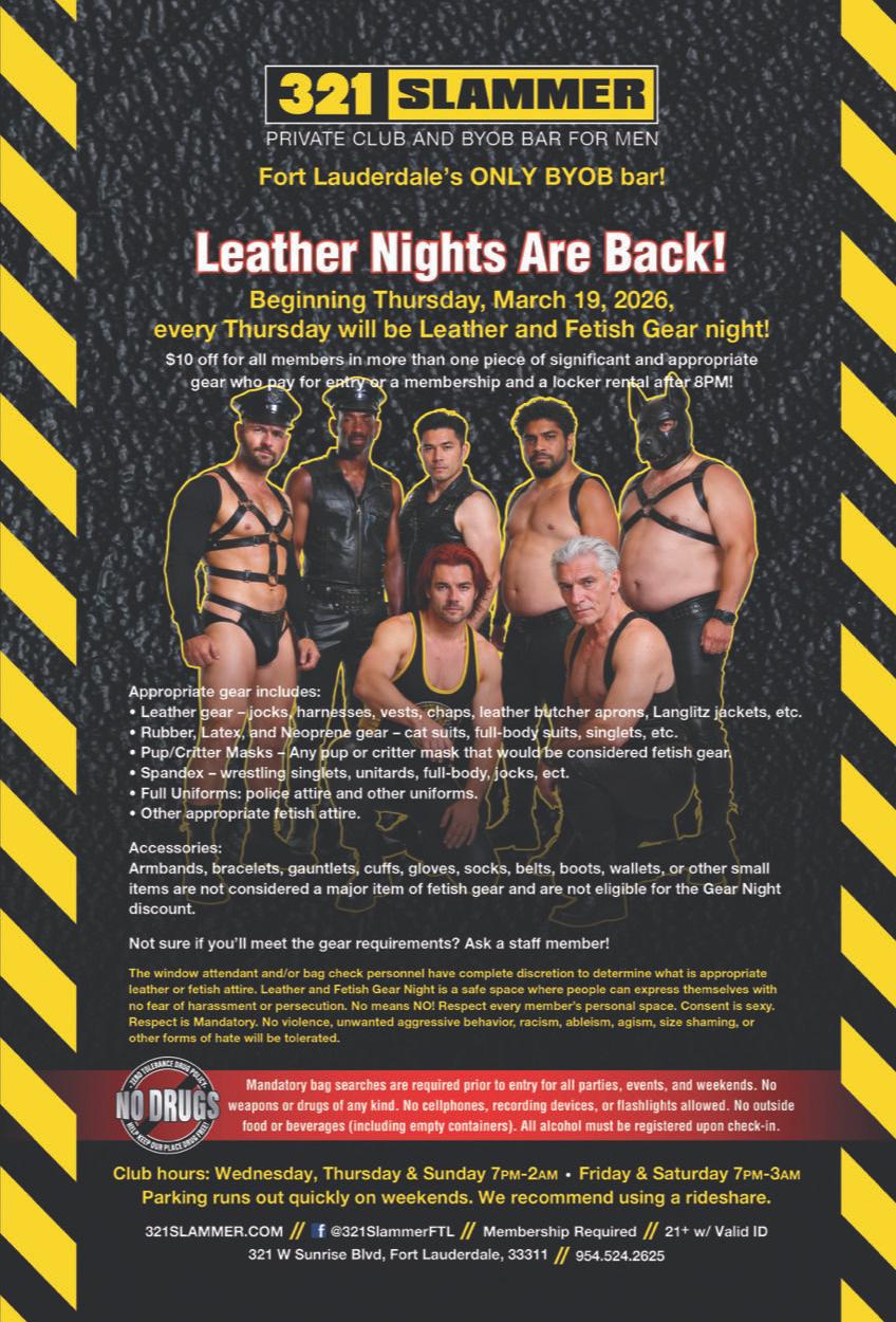 321 Slammer presents the return of Leather and Fetish Gear nights starting tonight and every Thursday thereafter. $10 off for all members in more than one piece of significant and appropriate gear after 8pm.