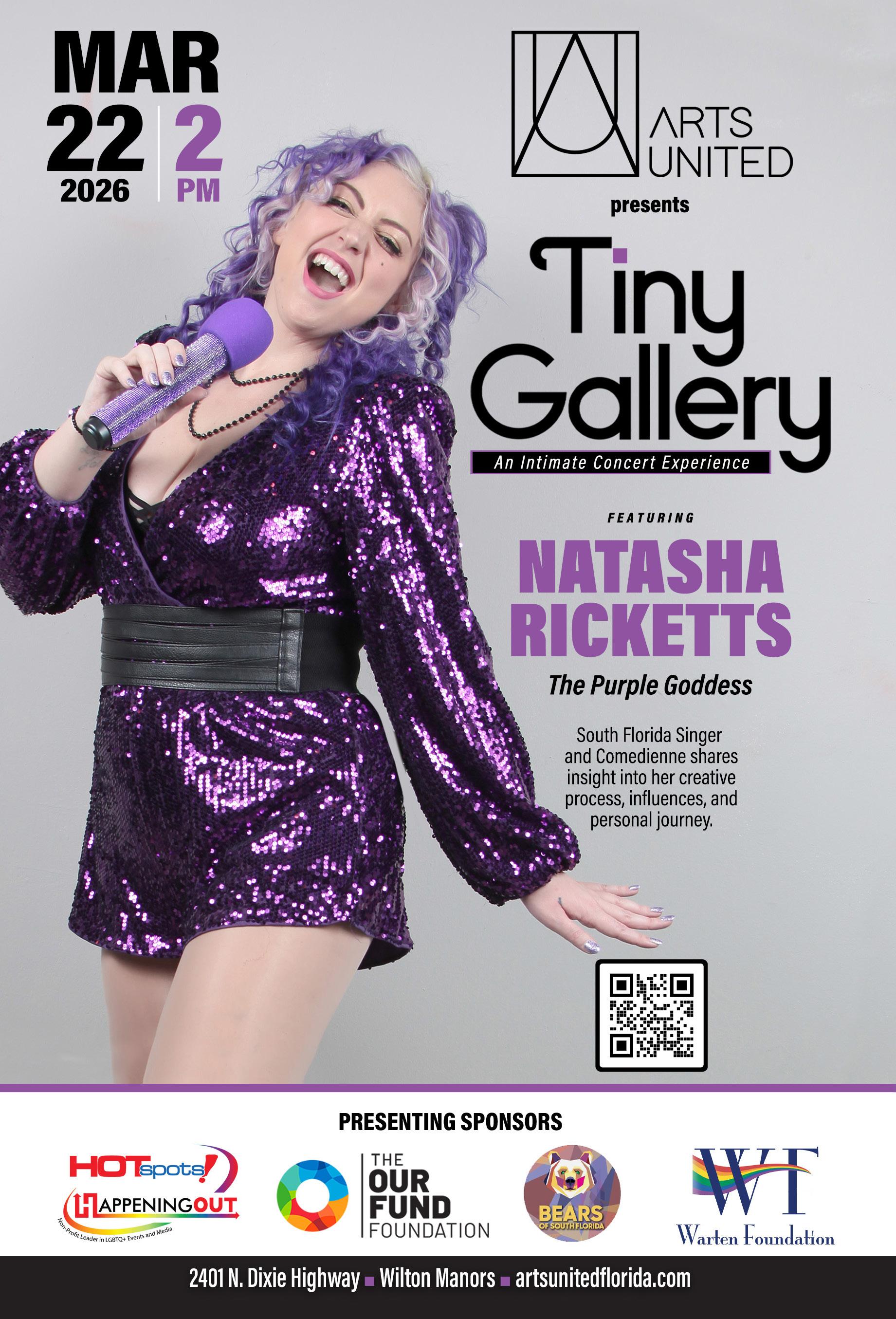 Arts United Gallery presents “Tiny Gallery: An Intimate Concert Experience” at 2pm featuring Natasha Ricketts (The Purple Goddess). This south Florida singer and comedienne shares insight into her creative process, influences, and personal journey. For more information, go to Artsunitedflorida.com.