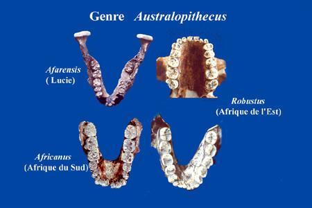 Les canines et les incisives des Australopithèques sont de petite taille. Cependant, les prémolaires et les molaires en se spécialisant, se développent fortement grâce à leur mode de vie végétarien. Ils peuvent avoir un volume de deux à deux fois plus grand que le nôtre. Elles sont en série croissante, la dent de sagesse est la plus grande, mais elle trouve toujours sa place dans l'arcade.