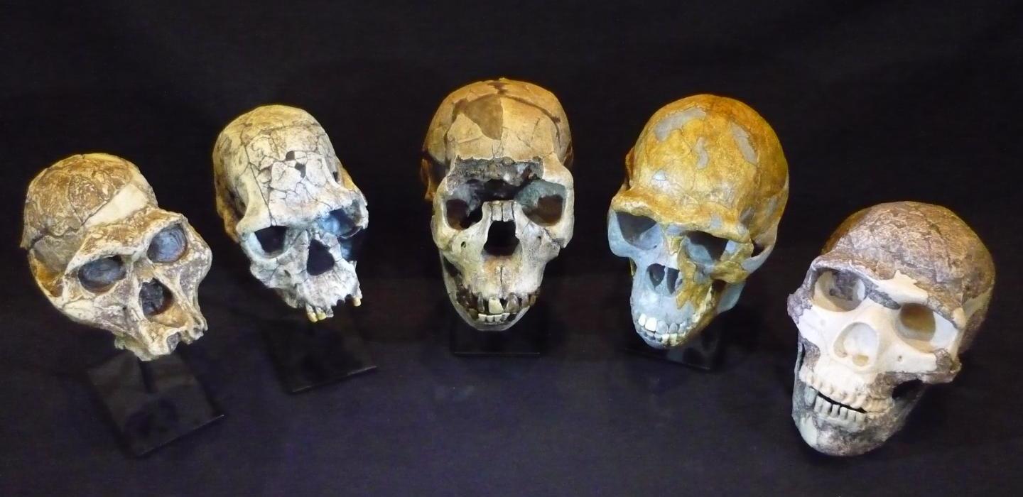 Figure 19: Ce sont des moulages de crânes issus de l’évolution humaine. De gauche à droite : Australopithecus afarensis, Homo habilis, Homo ergaster, Homo erectus et Homo neanderthalensis