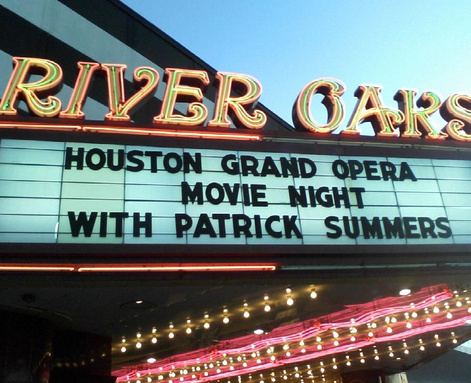 Opposite page: at the Rothko Chapel. This page, clockwise from top: with Frederica von Stade; Saul (HGO, 2019); Das Rheingold (HGO, 2014); with Lynn Wyatt; with Carlisle Floyd; River Oaks Theatre marquee in 2011; with Daniel Catán, Jake Heggie, and Mark Adamo; conducting at Opera in the Park in 1998.