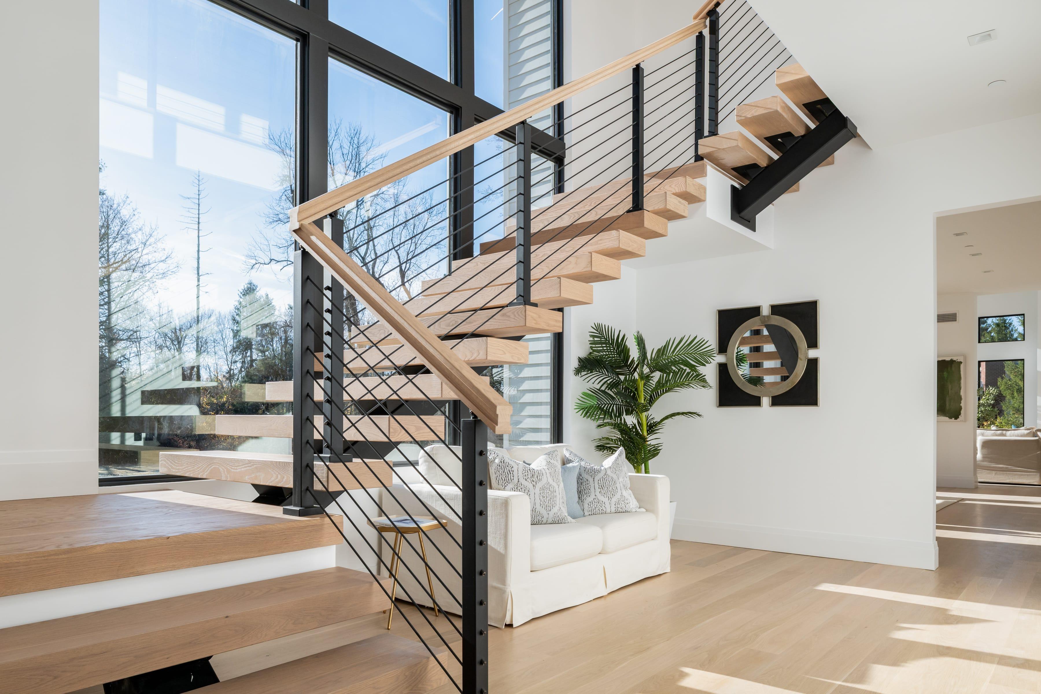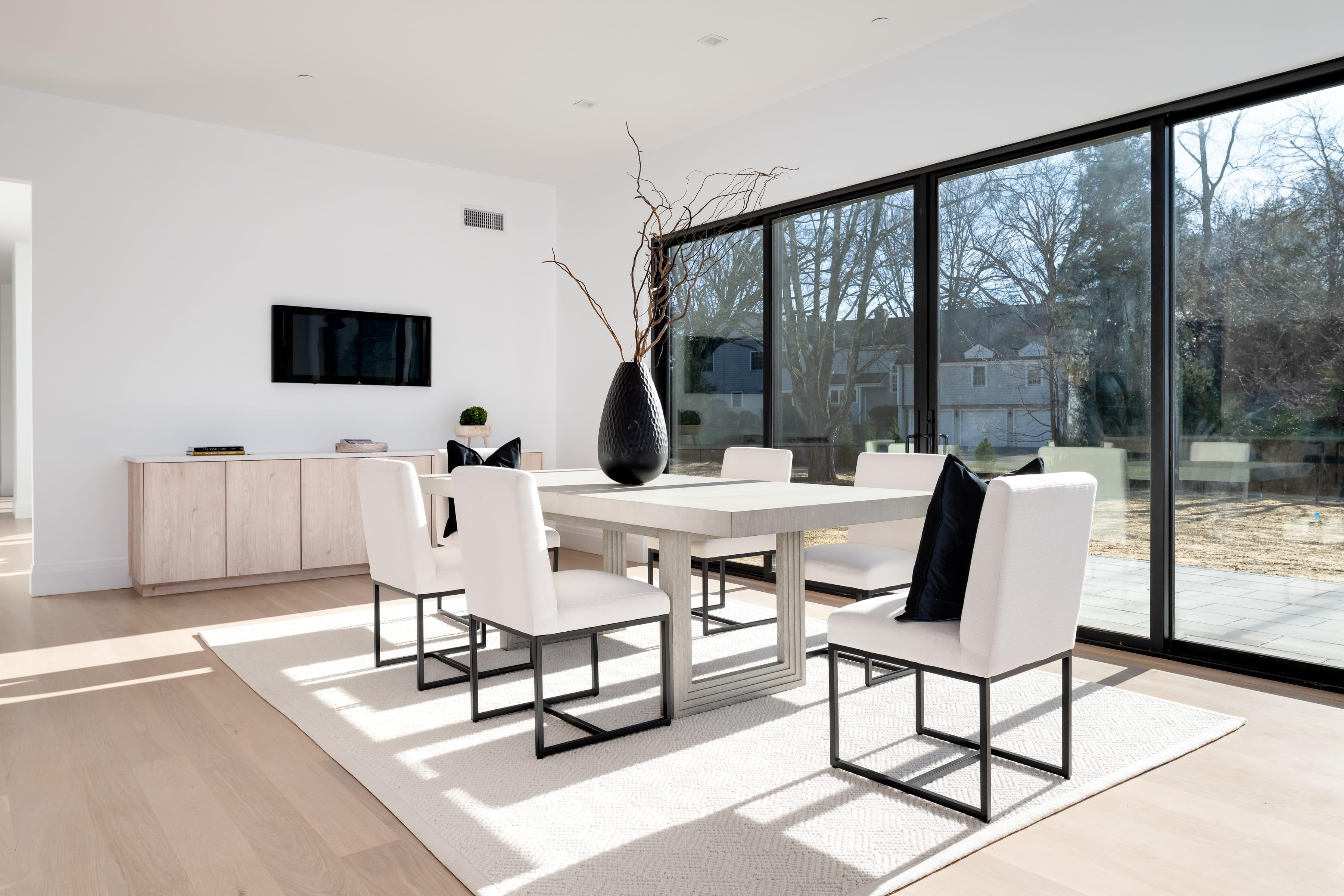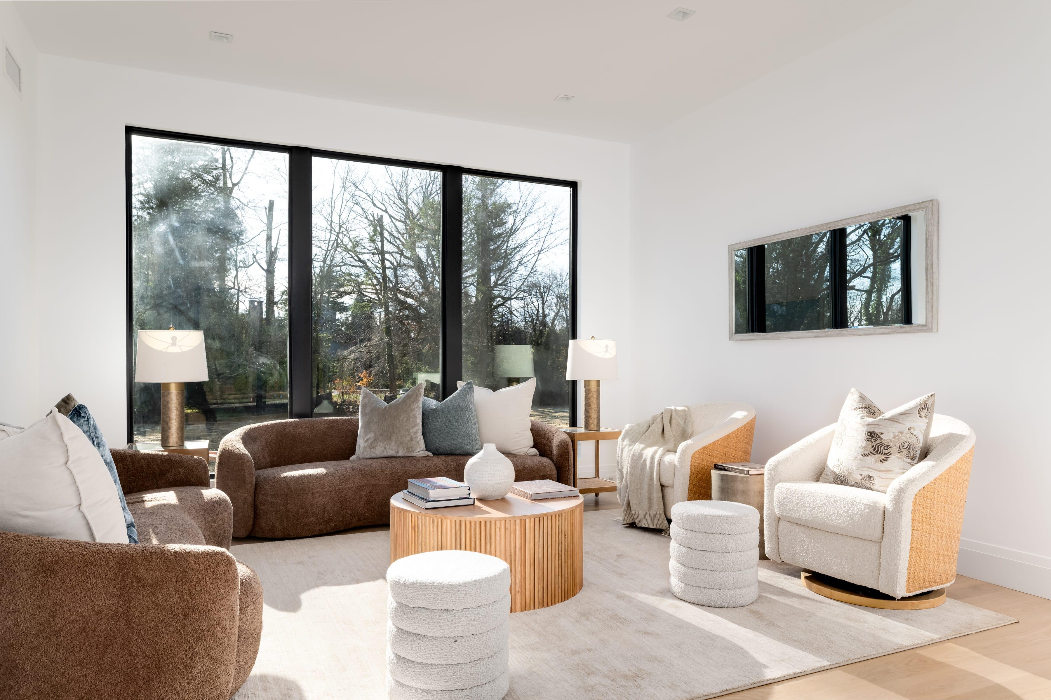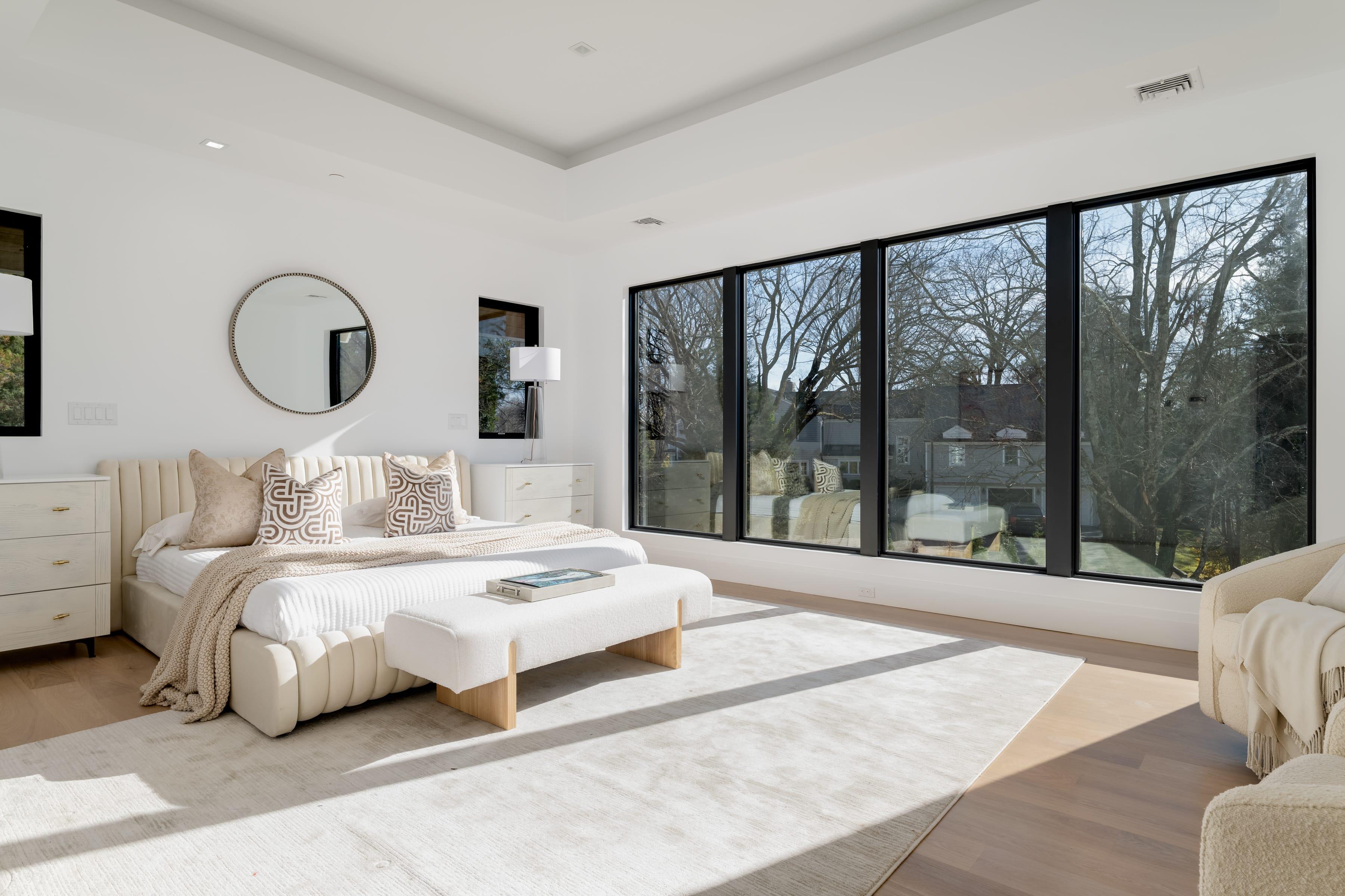 • Chef’s kitchen with waterfall quartz island & European cabinetry