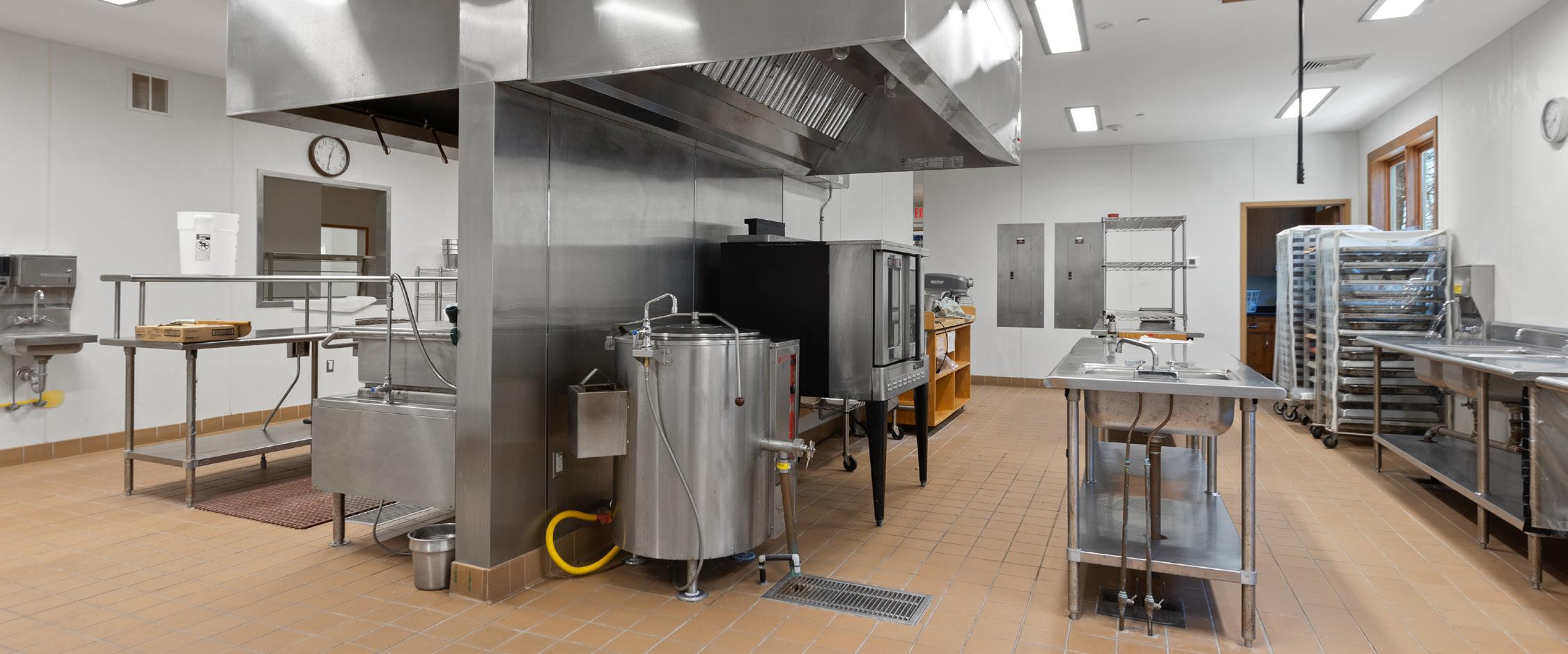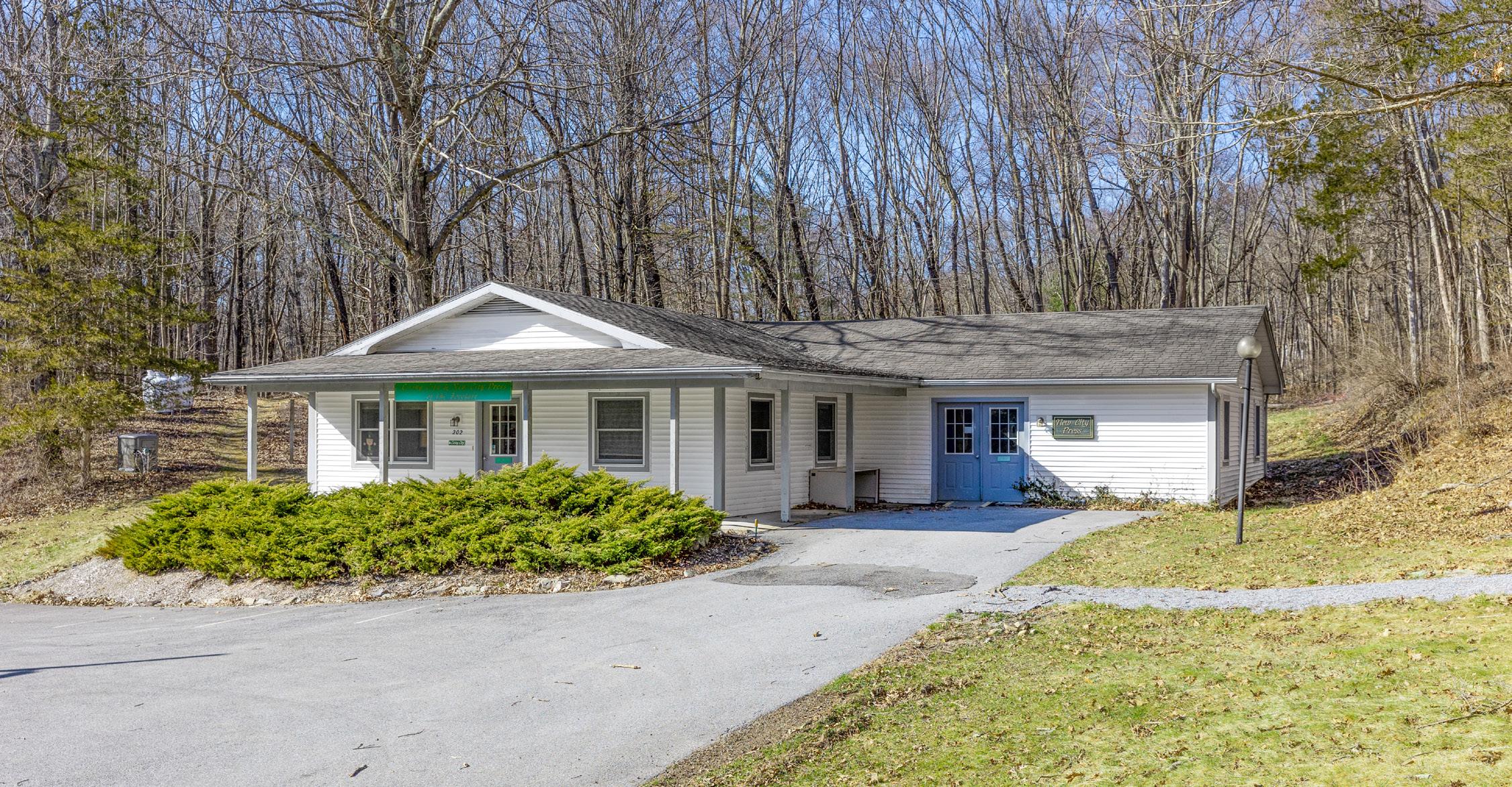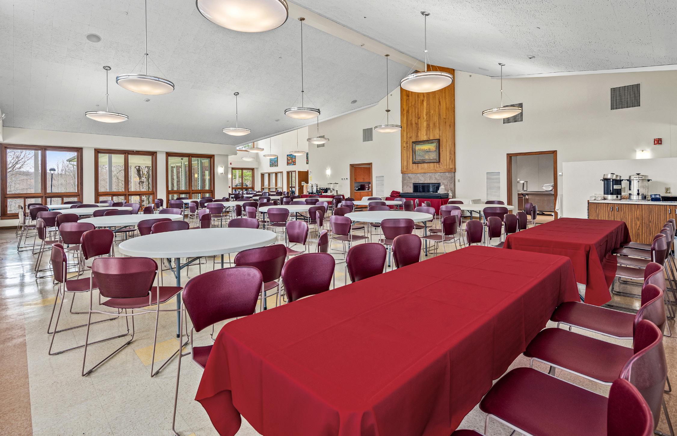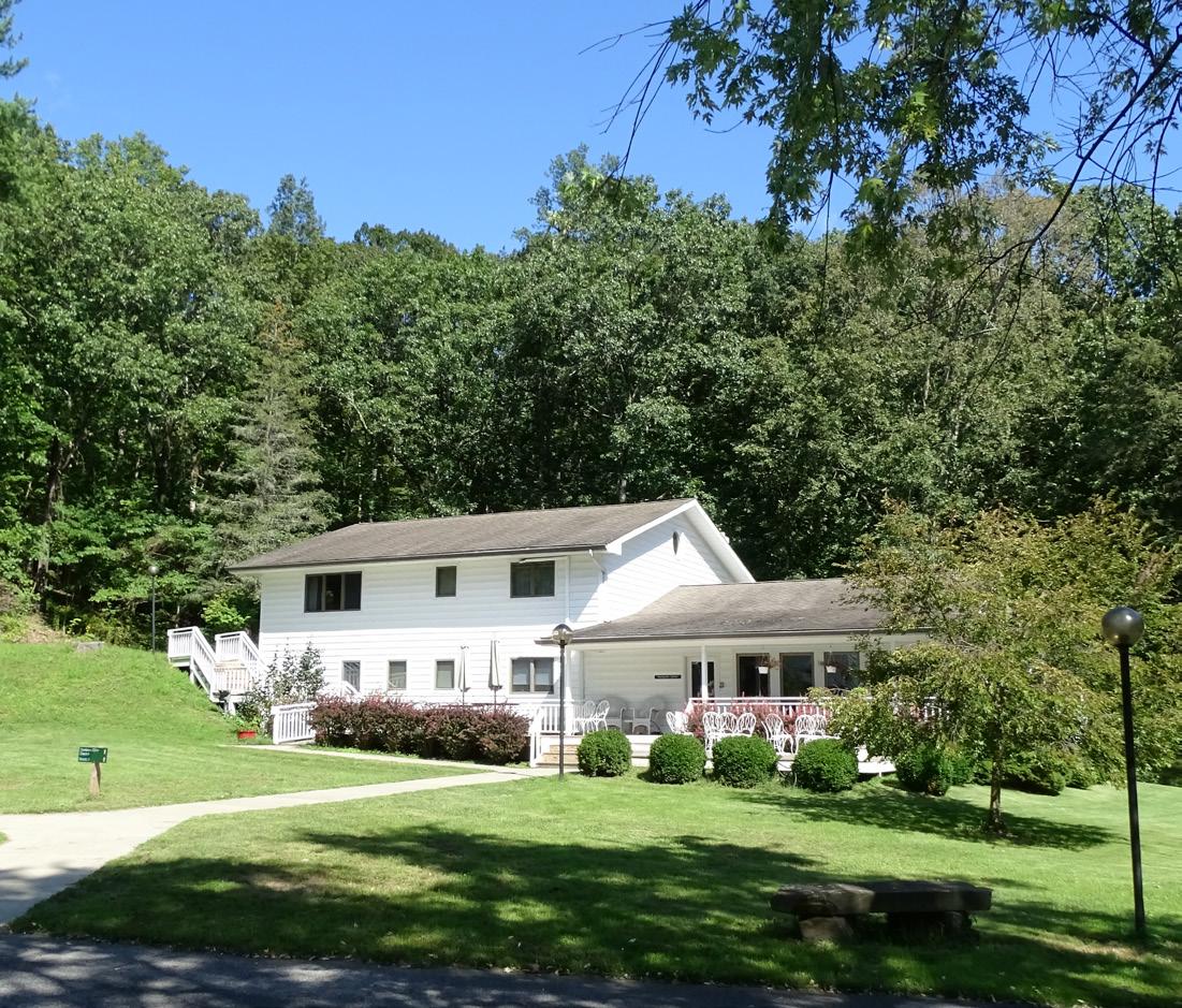 Single-story, wood frame structure with surrounding porch containing 7,755 sq. ft. Newly renovated dining facility with 220 seating capacity, propane fireplace at foyer, forced air heat and central air conditioning, commercial catering kitchen, storage room with ulility sink, staff office. Modern wood casement windows, vinyl siding, women’s bathroom (4 stalls) and men’s bathroom (2 stalls). Linoleum flooring and tile flooring in kitchen. Pendant lighting. Lower level contains hot water heater, water softener and electrical panels. Paved macadam walking paths and parking area. Roofing is architectural asphalt tiles.