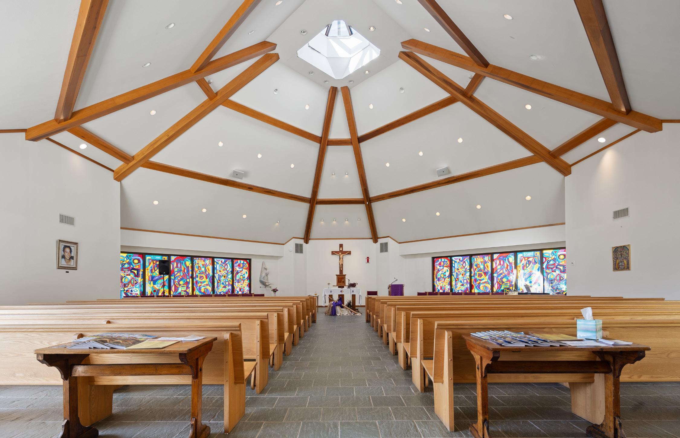 Single-story, steel frame structure with natural wood exterior containing 5,438 sq. ft featuring worship space, two office/storage rooms and a public bathroom. Slate floor, copper entry doors, casement windows, stained glass windows, vaulted ceiling, baseboard heating, central air conditioning. Lower level meeting hall with two bathrooms, baseboard heat and central air conditioning, wall to wall carpeting, private water treatment plant. Roofing is copper with copper leaders and gutters.