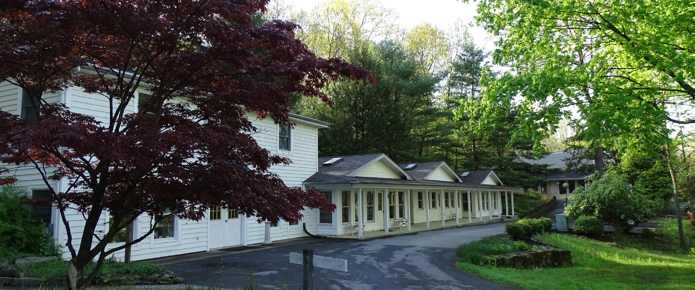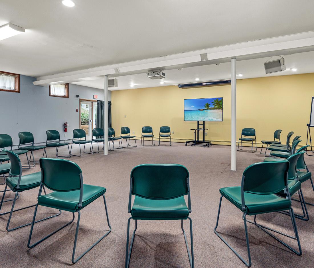 Part one- and two-story, wood frame structure with vinyl siding and front porch containing 6,194 sq. ft. featuring entry foyer offices, eight guest rooms each with its own bathroom, meeting room, laundry room, shower room. Casement windows, wood-plank flooring, open wooden staircase. Central air conditioning and forced air heating Lower level meeting hall (Belcher Hall) with bathrooms, a/v room, and mechanical room Baseboard heat at lower level Roofing is architectural asphalt tiles