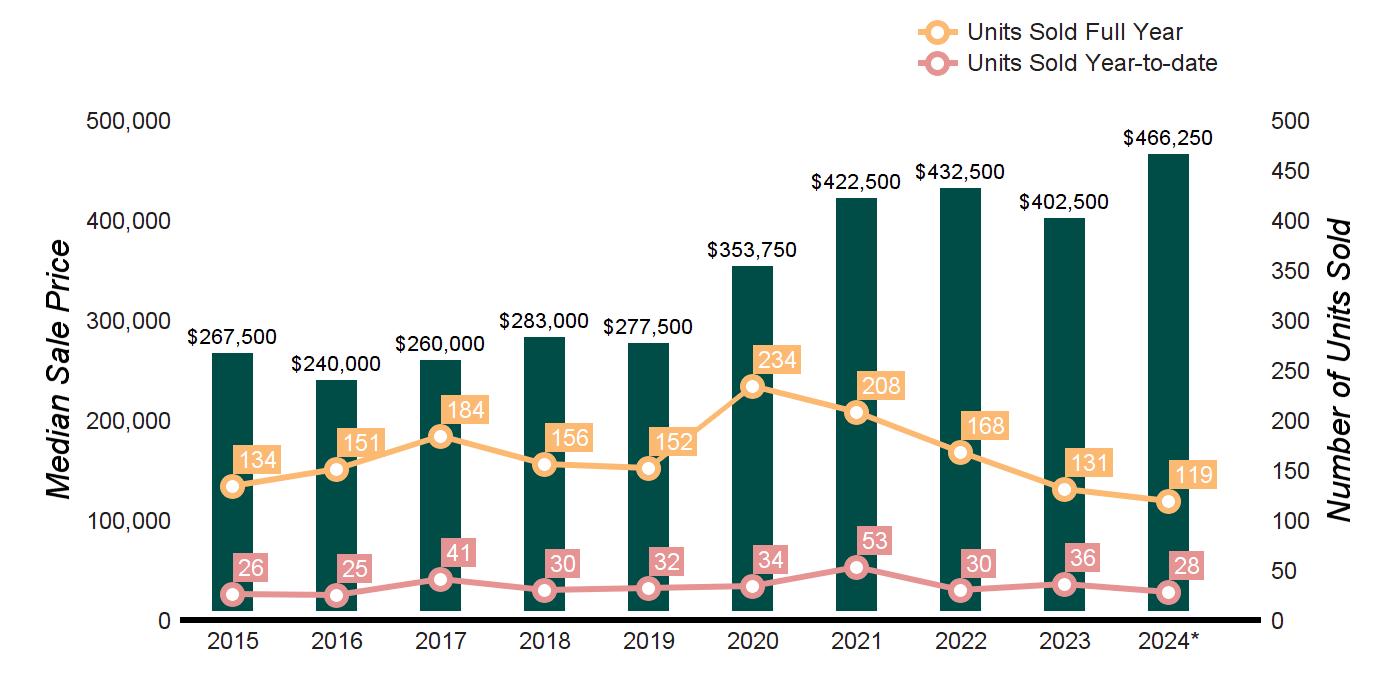 Q1 2024 Q1 2023 % CHANGE FULL YEAR 2023 FULL YEAR 2022 % CHANGE UNITS SOLD 60 78 -23.1% 300 410 -26.8% AVERAGE SALE PRICE $318,330 $307,455 3.5% $327,297 $288,609 13.4% MEDIAN SALE PRICE $254,500 $264,500 -3.8% $276,000 $243,750 13.2% AVERAGE PRICE PER SQUARE FOOT $246 $217 13.4% $246 $226 8.8% AVERAGE DAYS ON MARKET 43 66 -34.8% 61 59 3.4% % SALE PRICE TO LIST PRICE 100.3 98.6 1.7% 100.1 100.4 -0.3% SUPPLY DEMAND ANALYSIS AS OF MARCH 31, 2024 AS OF MARCH 31, 2023 2024 vs. 2023 PRICE RANGE SUPPLY: ACTIVE LISTINGS DEMAND: PENDING SALES SUPPLY/ DEMAND RATIO* SUPPLY: ACTIVE LISTINGS DEMAND: PENDING SALES SUPPLY/ DEMAND RATIO* % CHANGE IN LISTINGS % CHANGE IN PENDINGS $0 - $299,999 19 17 1 14 23 1 35.7% -26.1% $300,000 -$399,999 7 8 1 6 4 2 16.7% 100.0% $400,000 - $499,999 3 4 1 7 1 7 -57.1% 300.0% $500,000 - $599,999 5 7 1 2 0 Not Valid 150.0% 0.0% $600,000 - $799,999 3 3 1 9 0 Not Valid -66.7% 0.0% $800,000 - $999,999 5 1 5 10 0 Not Valid -50.0% 0.0% $1,000,000 - $1,999,999 1 0 Not Valid 3 0 Not Valid -66.7% 0.0% $2,000,000 and up 0 0 Not Valid 0 0 Not Valid 0.0% 0.0% MarketTotals 43 40 1 51 28 2 -15.7% 42.9% *Supply Demand Ratio Key 1-4: High Demand 5-6: Balanced 7-9: Low Demand 10+: Very Low Demand TEN-YEAR MARKET HISTORY Average Sale Price $182,671 $177,964 $185,574 $192,214 $199,727 $246,357 $281,988 $288,609 $327,297 $318,330 Average Sale Price Average Price/SqFt $129 $130 $139 $144 $153 $181 $209 $226 $246 $246 Average Price/SqFt Days On Market 162 141 111 99 109 91 91 59 61 43 Days On Market %Sale Price to List Price 97.0 96.4 96.7 97.0 97.6 97.3 98.1 100.4 100.1 100.3 %Sale Price to List Price