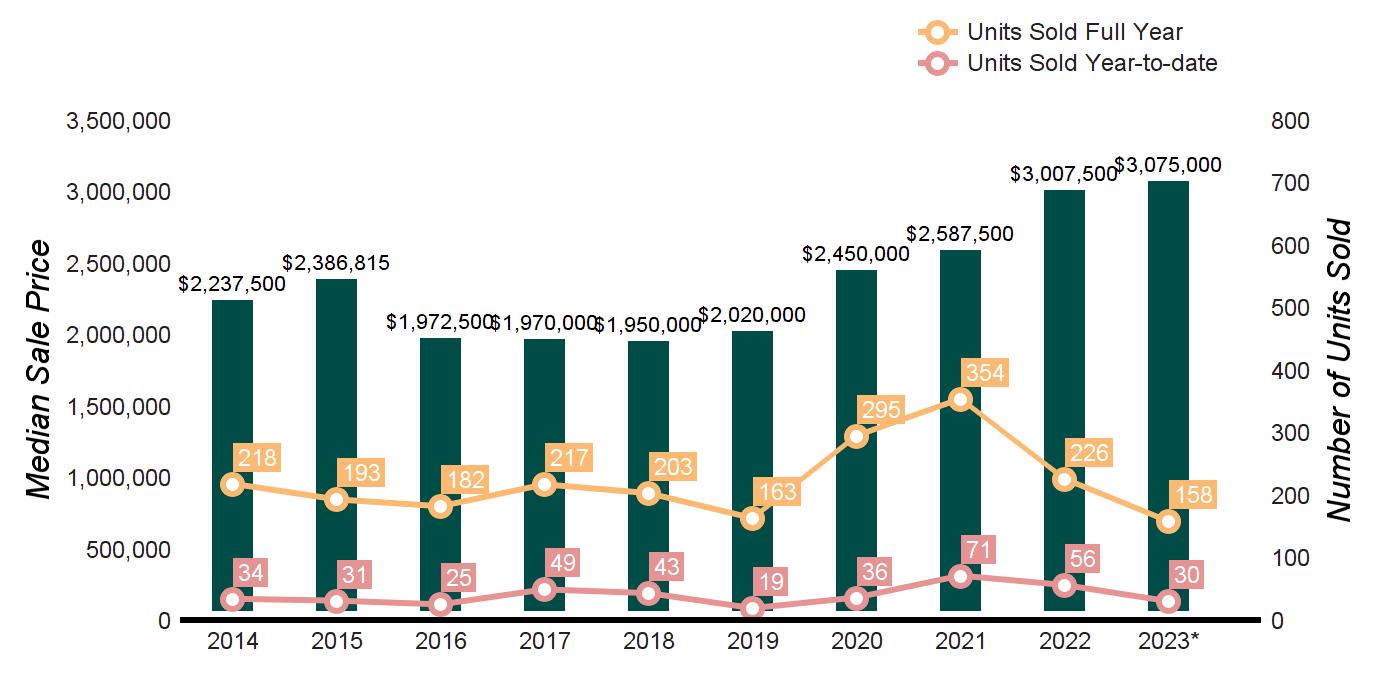 Q1 2023 Q1 2022 % CHANGE FULL YEAR 2022 FULL YEAR 2021 % CHANGE HOMES SOLD 6 17 -64.7% 64 124 -48.4% AVERAGE SALE PRICE $3,287,333 $3,398,352 -3.3% $3,288,974 $3,926,817 -16.2% MEDIAN SALE PRICE $3,350,000 $3,500,000 -4.3% $2,505,000 $2,392,500 4.7% AVERAGE PRICE PER SQUARE FOOT $929 $697 33.3% $752 $712 5.6% AVERAGE DAYS ON MARKET 146 167 -12.6% 85 137 -38.0% % SALE PRICE TO LIST PRICE 97.4% 97.3% 0.1% 99.6% 95.6% 4.2%