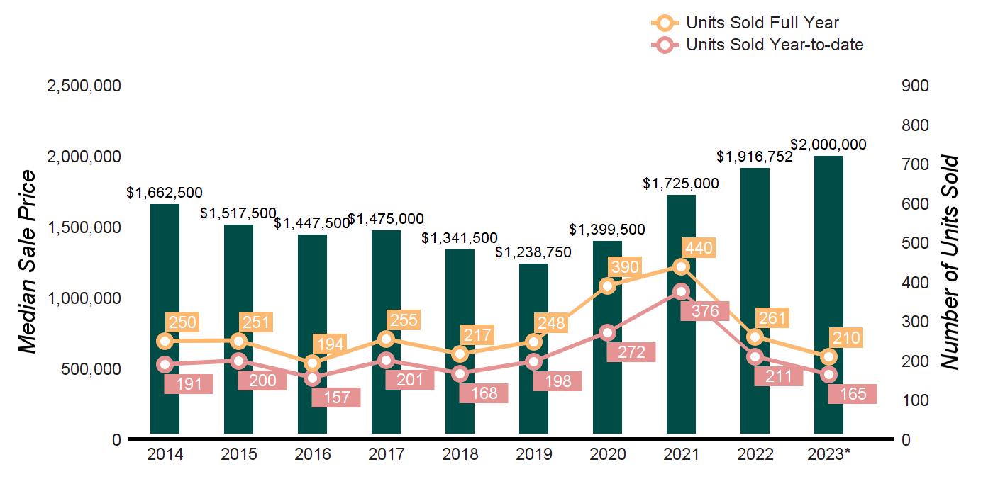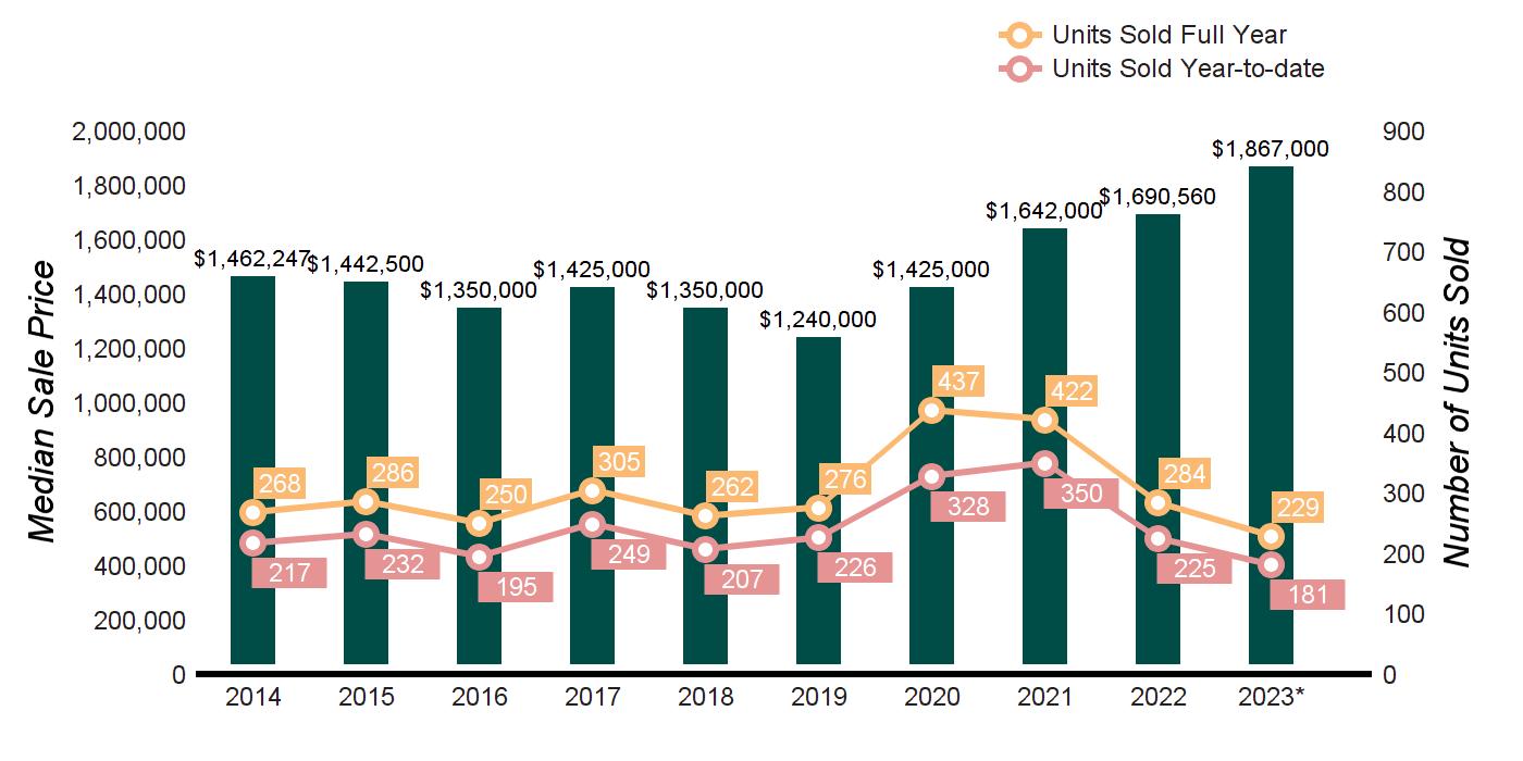 Q3 2023 Q3 2022 % CHANGE YTD 2023 YTD 2022 % CHANGE HOMES SOLD 74 83 -10.8% 181 225 -19.6% AVERAGE SALE PRICE $2,167,833 $1,932,206 12.2% $2,499,606 $1,969,187 26.9% MEDIAN SALE PRICE $1,765,000 $1,600,000 10.3% $1,867,000 $1,601,000 16.6% AVERAGE PRICE PER SQUARE FOOT $644 $559 15.2% $634 $563 12.6% AVERAGE DAYS ON MARKET 30 30 0.0% 32 36 -11.1% % SALE PRICE TO LIST PRICE 101.5% 103.4% -1.8% 98.6% 103.4% -4.6%