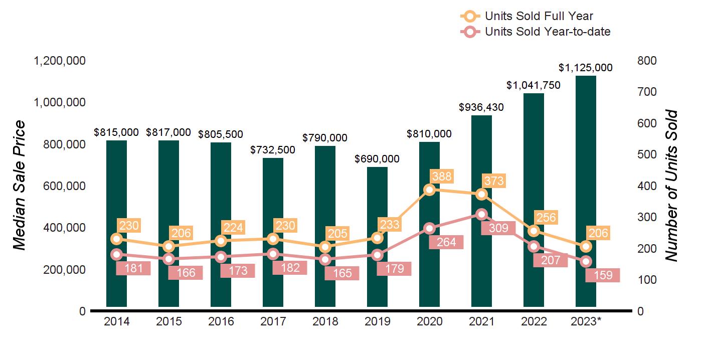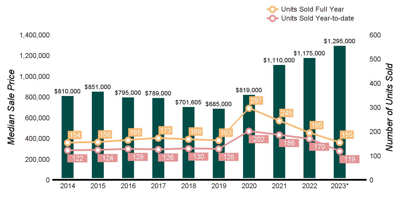Q3 2023 Q3 2022 % CHANGE YTD 2023 YTD 2022 % CHANGE HOMES SOLD 52 71 -26.8% 119 170 -30.0% AVERAGE SALE PRICE $1,526,242 $1,405,516 8.6% $1,352,985 $1,349,172 0.3% MEDIAN SALE PRICE $1,450,000 $1,200,000 20.8% $1,295,000 $1,192,500 8.6% AVERAGE PRICE PER SQUARE FOOT $335 $331 1.2% $327 $317 3.2% AVERAGE DAYS ON MARKET 35 53 -34.0% 45 56 -19.6% % SALE PRICE TO LIST PRICE 104.3% 103.7% 0.6% 103.8% 104.1% -0.3%